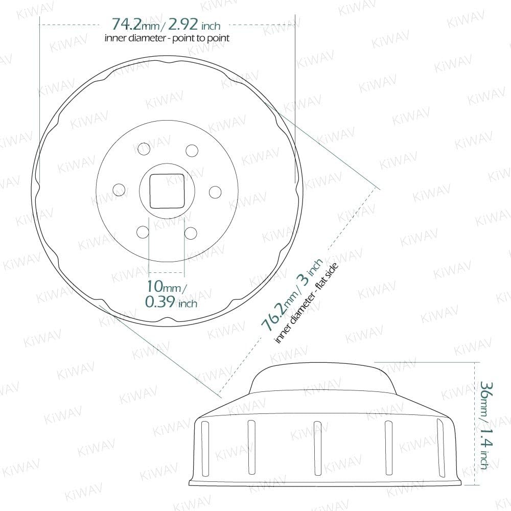 - A must have handtool for removal oil filter. Side to side 76.2mm, corner to corner 74.3mm, depth 19mm, please check your oil filter before ordering, or consute KiWAV for further assistance.