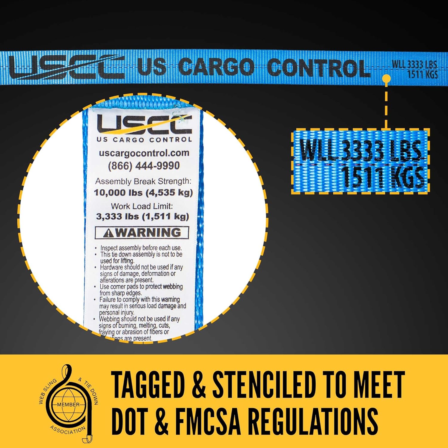 - QUICK IDENTIFICATION - US Cargo Control Tie Down Straps are tagged with working load limits and compliant with US DOT and Commercial Vehicle Safety Alliance (CVSA) guidelines, and meet or exceed Web Sling and Tie Down Association (WSTDA) standards.