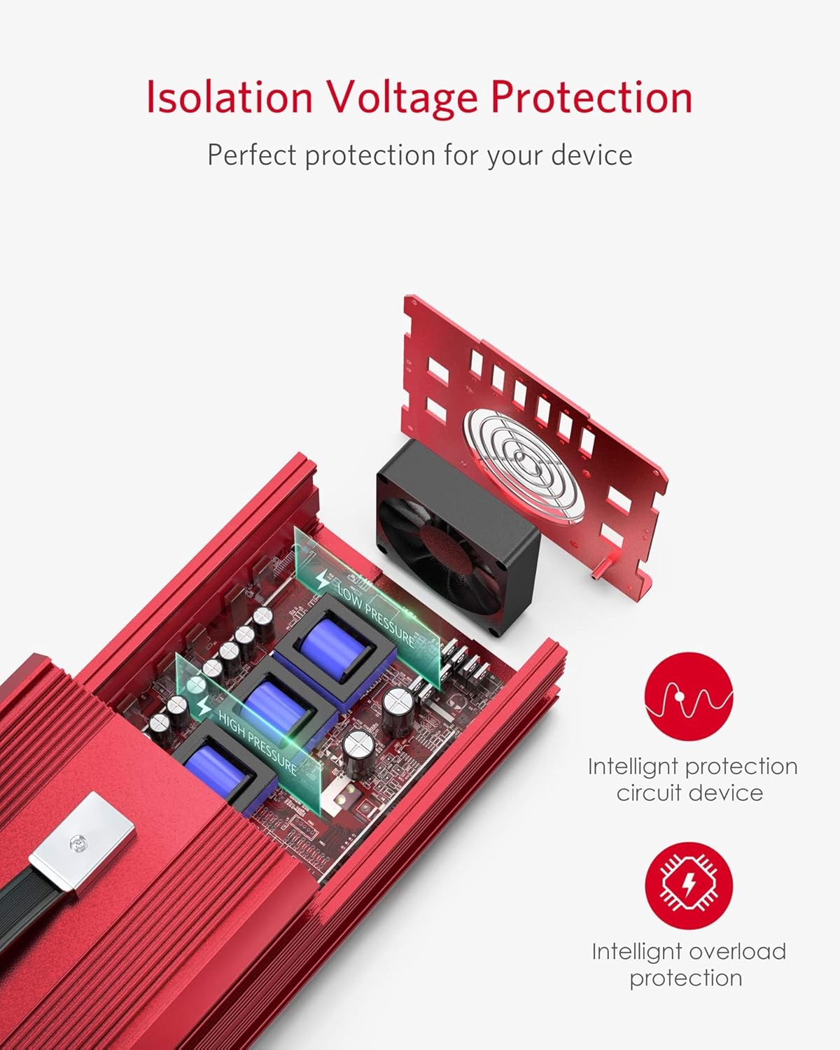 - Multi-Protection: Built-in 6 external 50A fuse to protect your devices from damage,including an audible overload/over/under voltage/short circuit alarm via LED light special high & low voltage isolated protection.Red light is under protection (shut down) and green light is working normally.