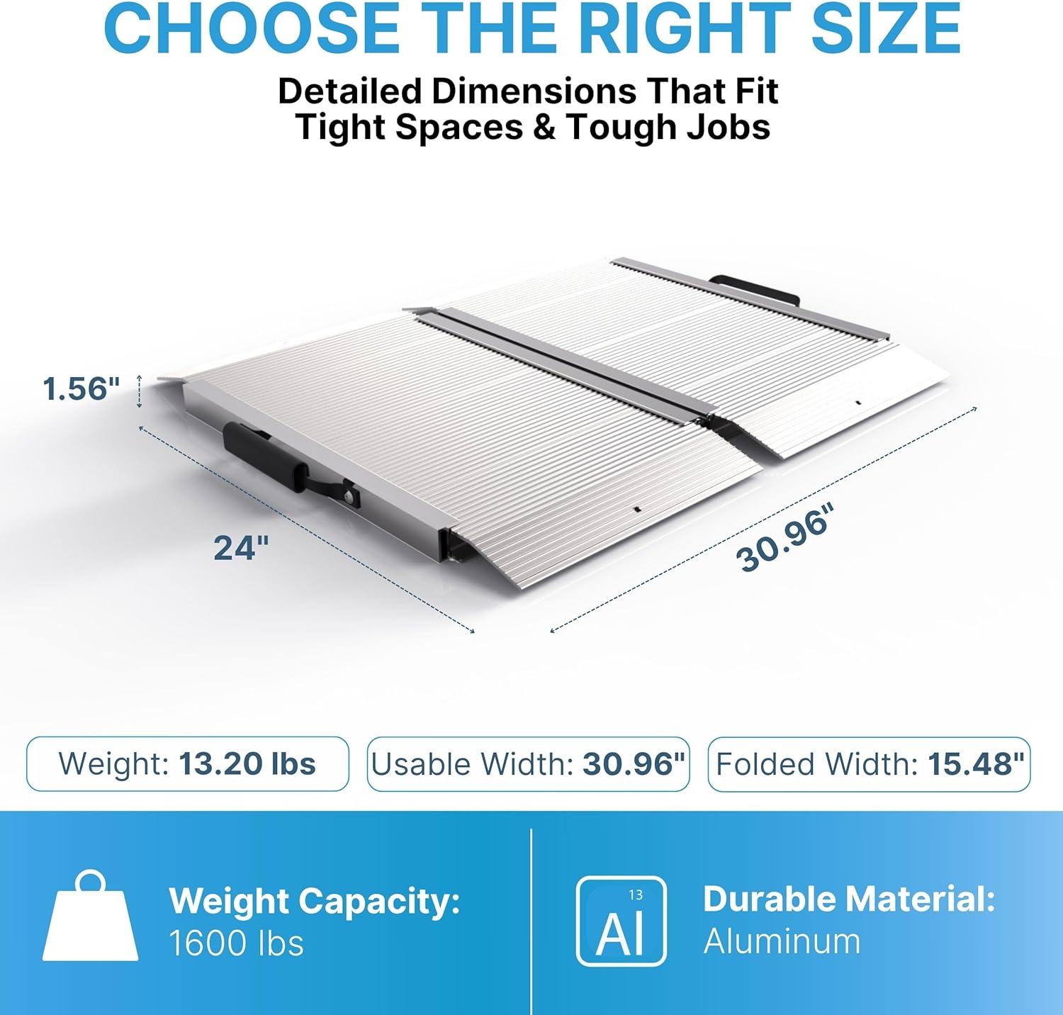 - Highly Portable: Easily foldable to a compact 15.48-inch width and can be conveniently stowed in a truck, trailer, shed, or van; Durable handles provide a comfortable grip for easy carrying without compromising the ramp's functionality