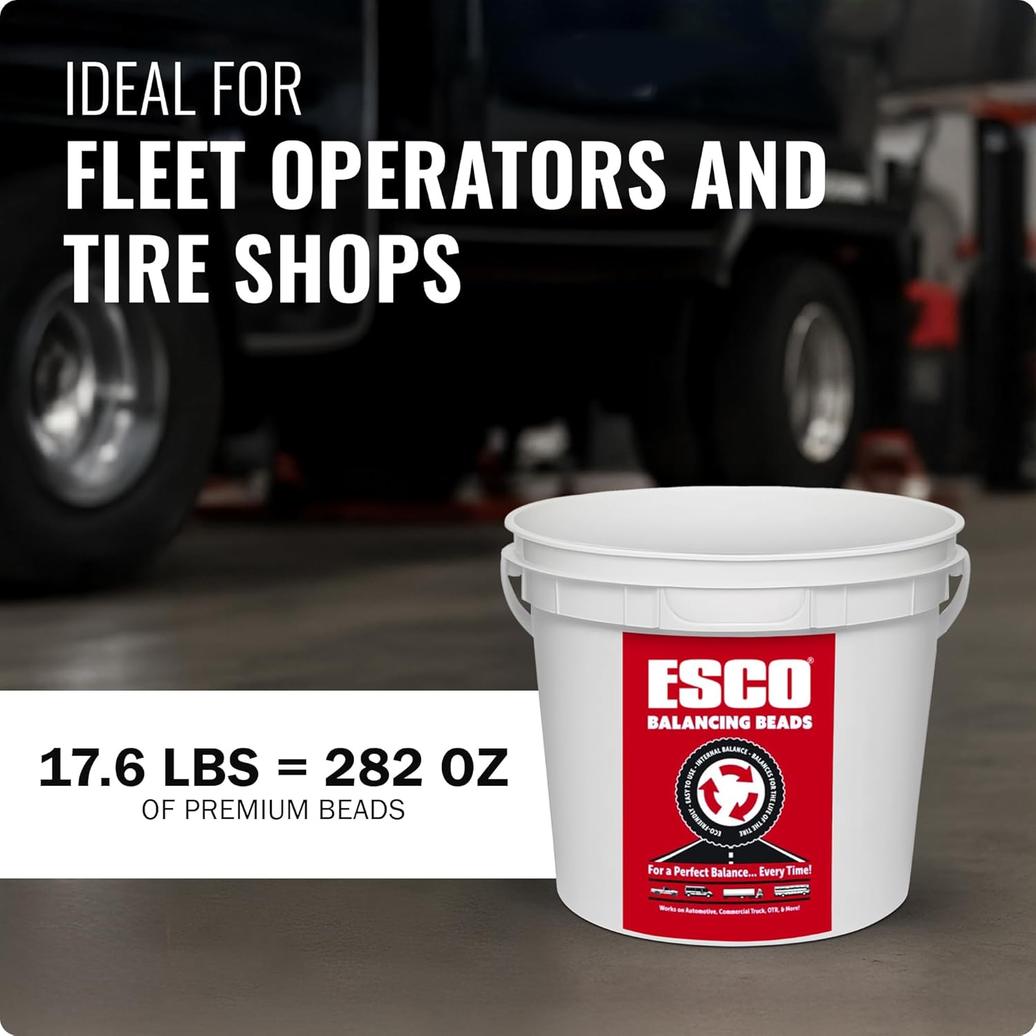 - EASY TO INSTALL: Install ESCO Balancing Beads by adding them during installation or by slightly separating the tire from the rim and pouring them in. Each 17.6 lb (282 oz) bucket includes a 3 oz scoop and a tire size chart for accurate, no-guesswork application. Ideal for mechanics, mobile service units, and tire shop supplies.