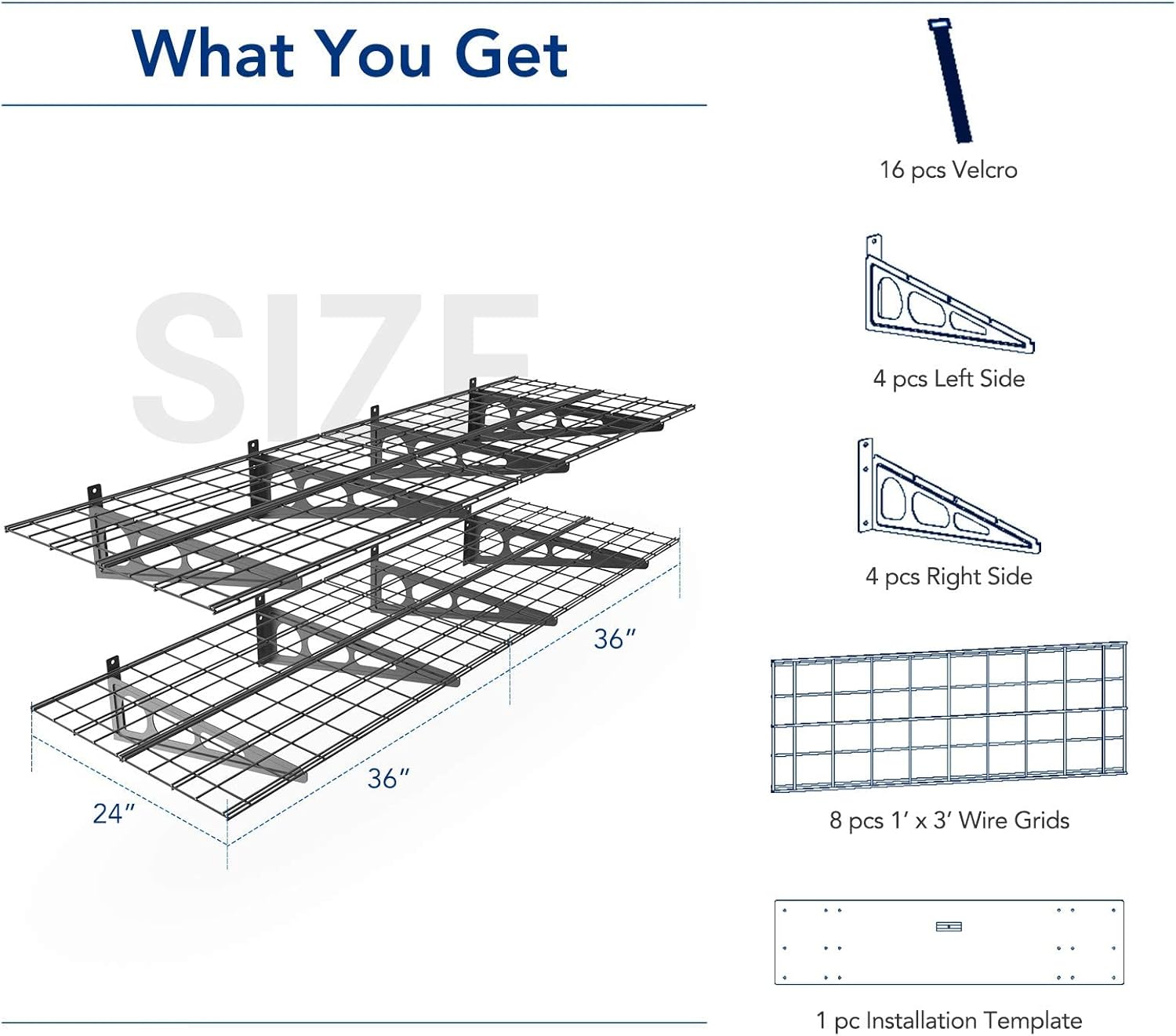 - This 2x6 ft garage shelf offers ample storage space for your garage, small pantry, or kitchen. (Composition of four 1'x3' shelves per tier). Perfect for organizing bulky items such as tools, tires, and heavy storage bins, this wall shelving is built tough to withstand extreme loads.