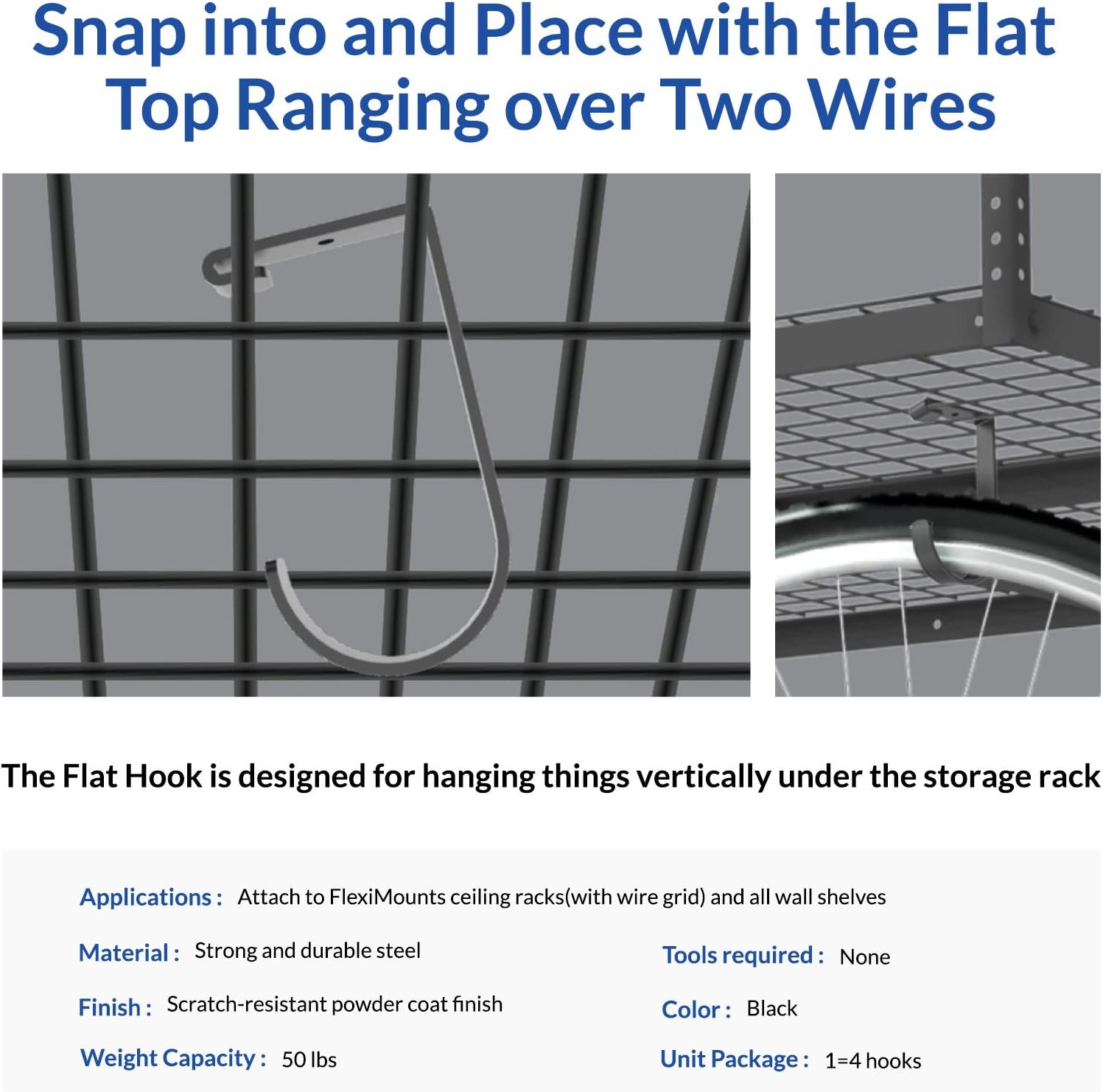 FLEXIMOUNTS 4 Pack Add On Storage Flat Hook Accessory for Garage Ceiling Rack and Wall Shelving, Max Weight Capacity up to 50lbs, Black