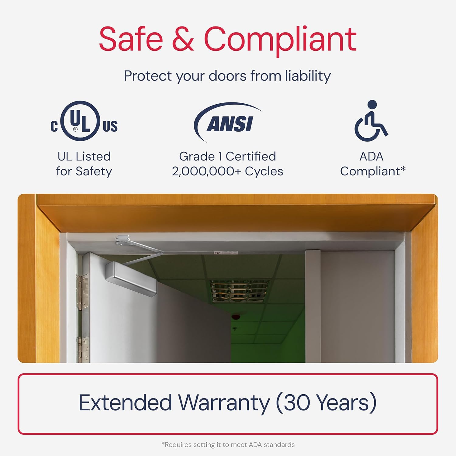 - UL & ADA Compliant – Protect your business from liability with rigorously tested hardware. Your pneumatic closer is certified by the Underwriter’s Lab & is ADA compliant, an accessibility necessity.