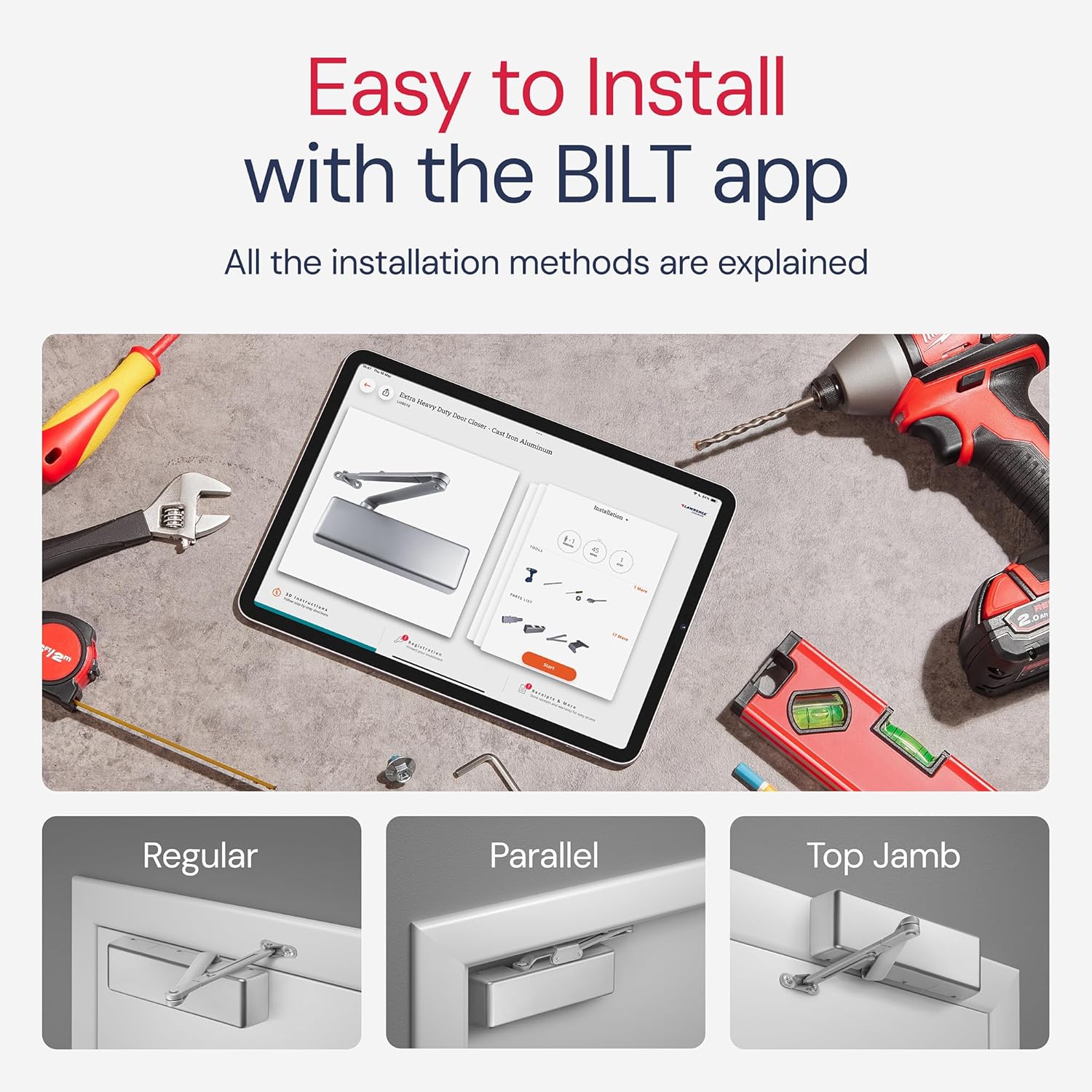 - Flexible Installation – Attach your closer in a left or right configuration to any common door frame and jamb material. Use a complete auto door closer set that accommodates wood, aluminum, & steel.