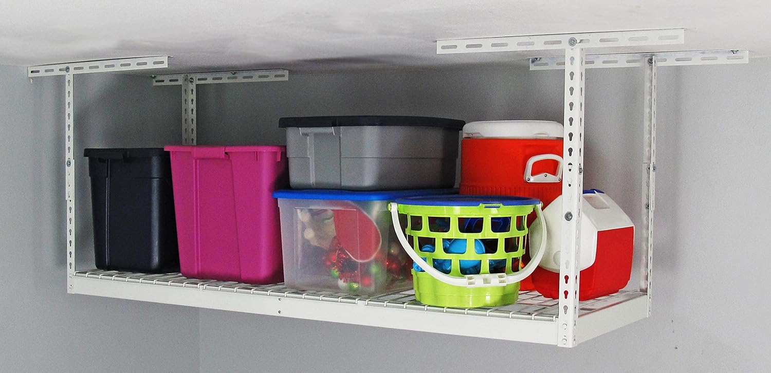 - Adjustable Overhead Rack: This garage storage rack has adjustable hanging storage for bikes, equipment, and bins.
