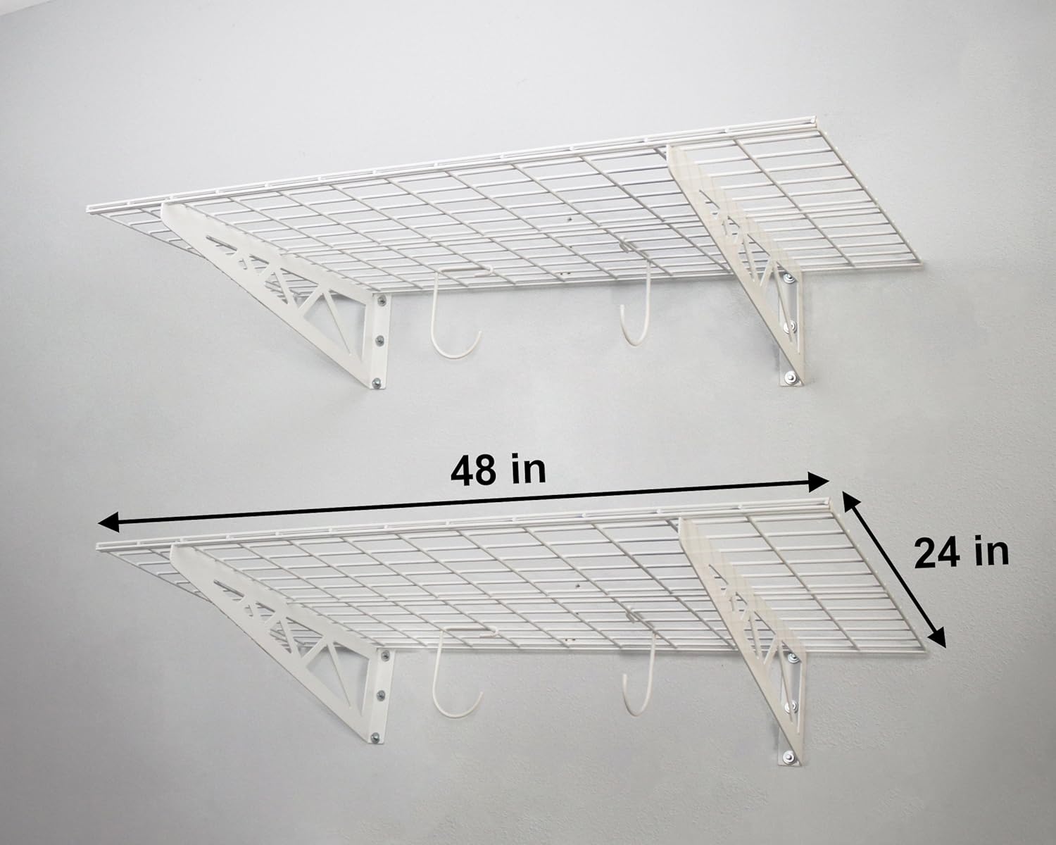 - MULTIFUNCTIONAL UTILITY RACK: Each pack includes (2) wall shelves and (4) versatile deck hooks that allow you to use them in many ways. Use them as storage racks and shelving in your basement, garage, pantry, or laundry room, and confidently hang your bicycle, golf accessories, canned goods, or yard tools and more to gain usable floor space.
