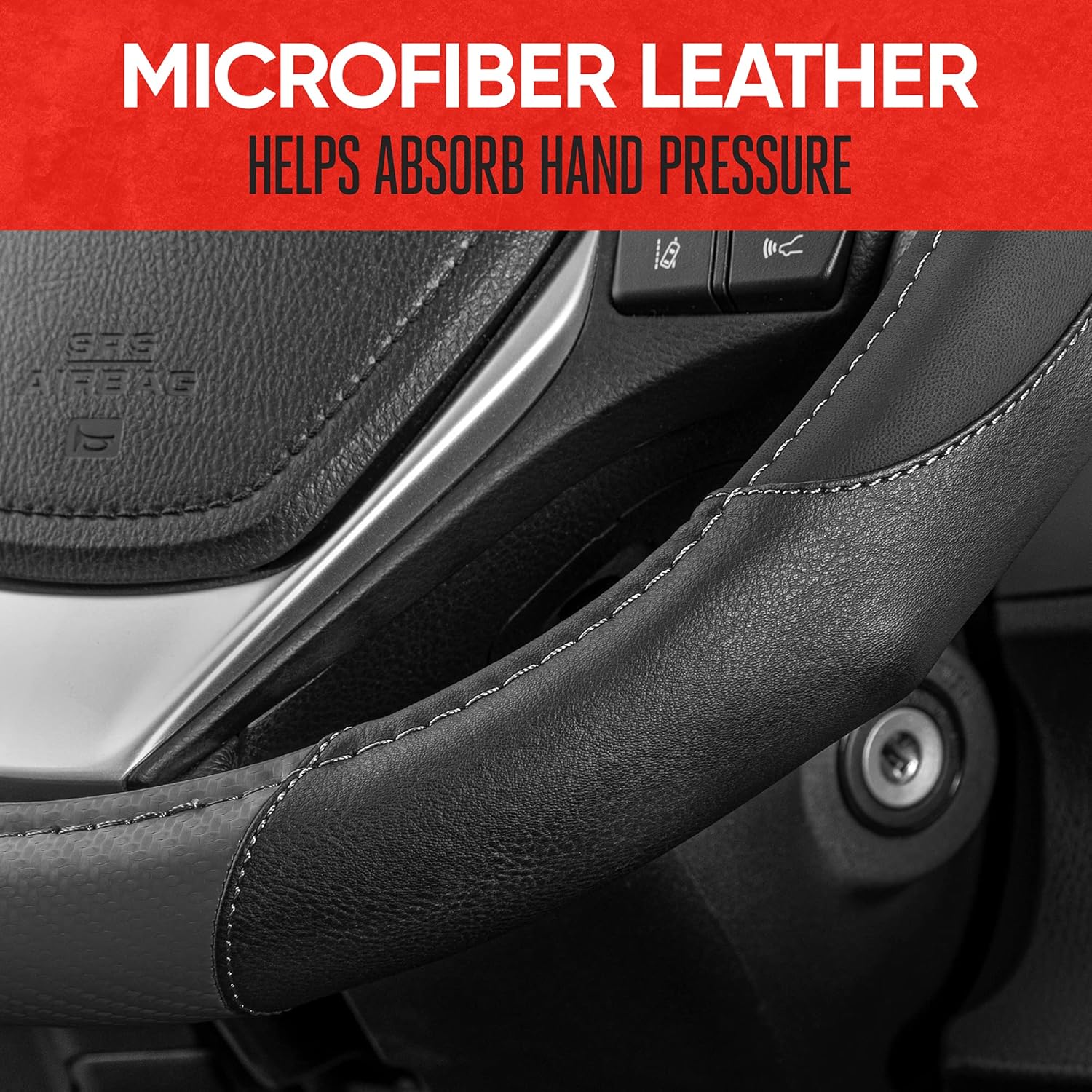 - SOFT and COMFORTABLE TOUCH β Long drives and daily commutes can leave your hands feeling tired and uncomfortable. Thatβs why we use microfiber leather throughout to help absorb hand pressure from the steering wheel Itβs soft yet durable with a breathable touch