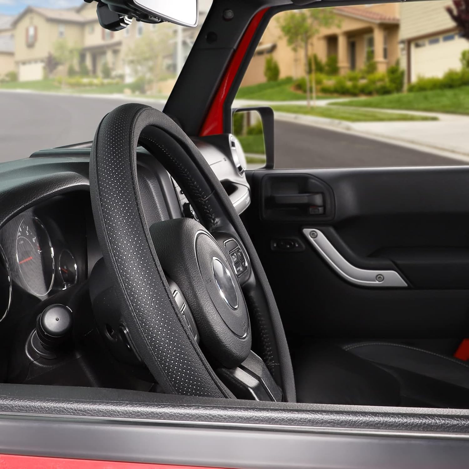 - NO MORE STICKY: The auto steering wheel cover is super comfy to hold, the pores on it are breathable and they absorb the hand-sweat that the summer heat causes, allowing you to grip the steering wheel firmly.