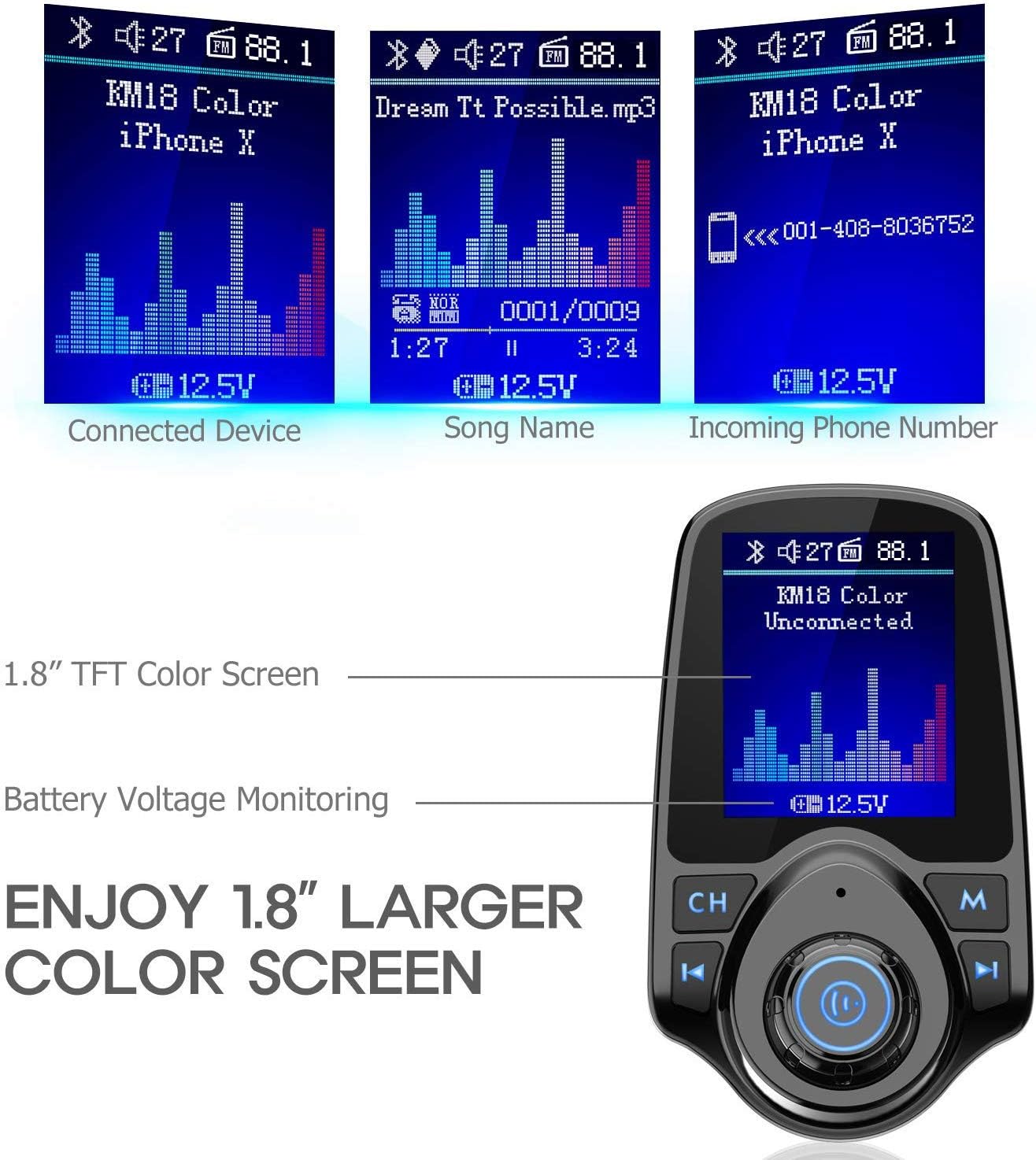 - Upgraded Version of Classic KM18: New KM18 Upgraded with 1.8β TFT color display screen, offers a wider visual interface for more information, such as incoming phone number, track name, FM frequency, battery voltage, Bluetooth connected device and more.