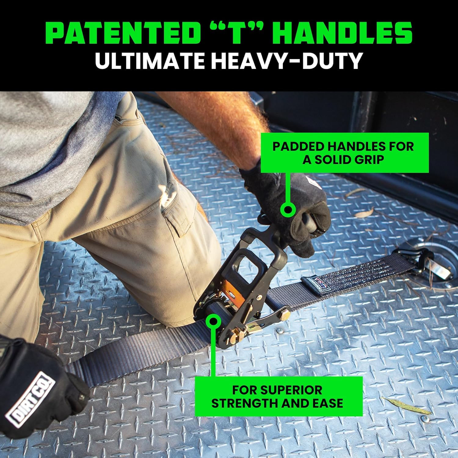 - THE COMPLETE TIE DOWN KIT - (4) Premium Axle Tie Down Straps, (4) T-Handle Ratchet Straps, Heavy Duty Oversized Storage Bag & Velcro for Securing Excess Strap