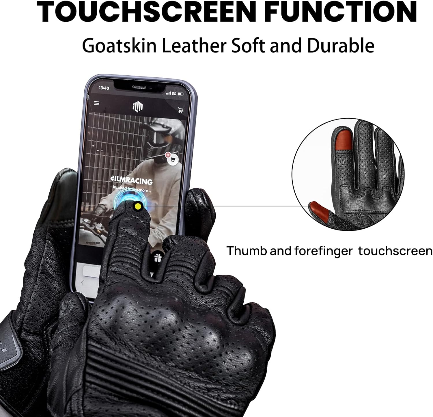 ILM Goatskin Leather Motorcycle Motorbike Powersports Racing Gloves Touchscreen for Men and Women Model DN01(L, Black Perforated)