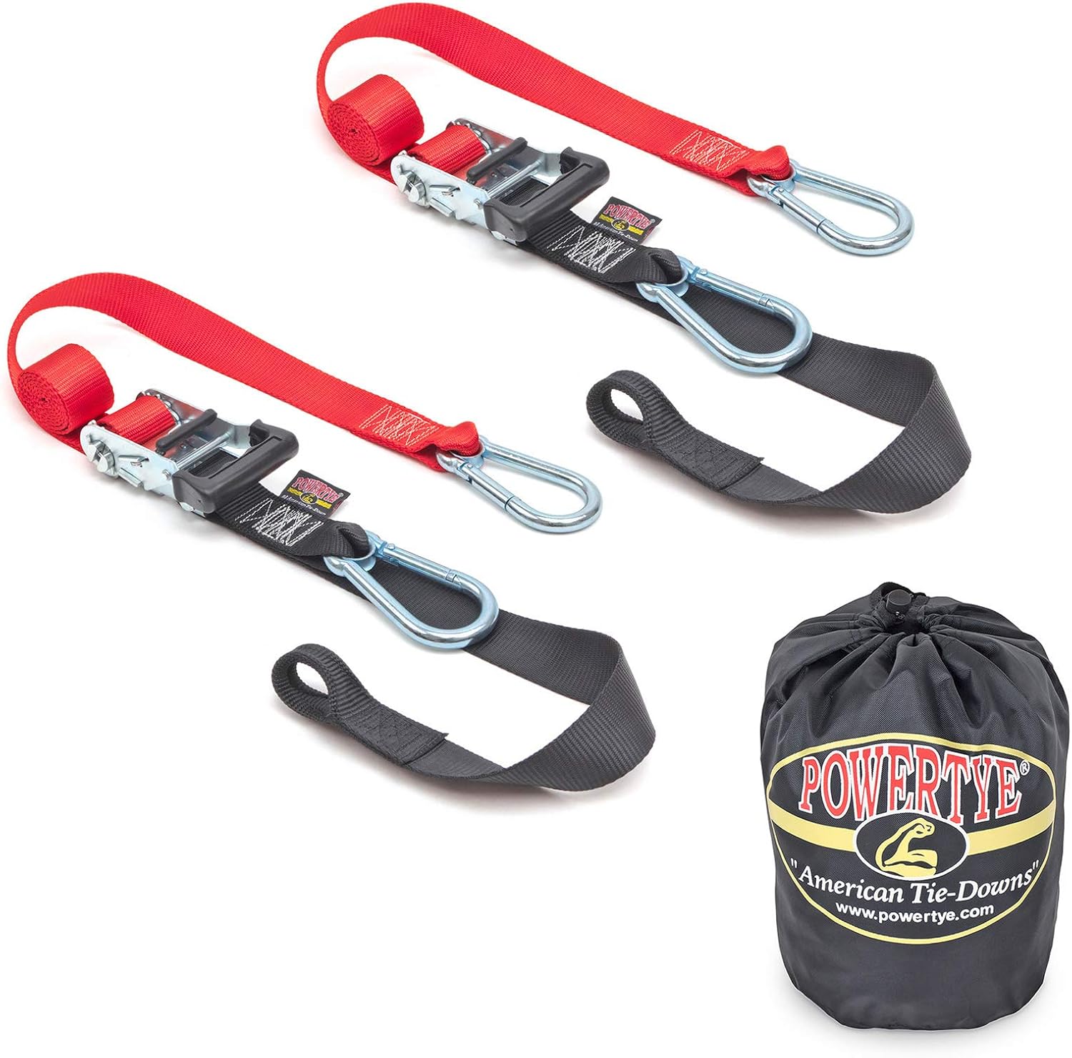 PowerTye - Made in USA - Heavy Duty Ratchet Tie Down Straps with Carabiner Hooks, Soft-Tye & Storage Bag, for Motorcycle, ATV, Trailer & Cargo, 1,000 lb WLL, 1.5 inch x 6.5ft Long, Red/Black (Pair)
