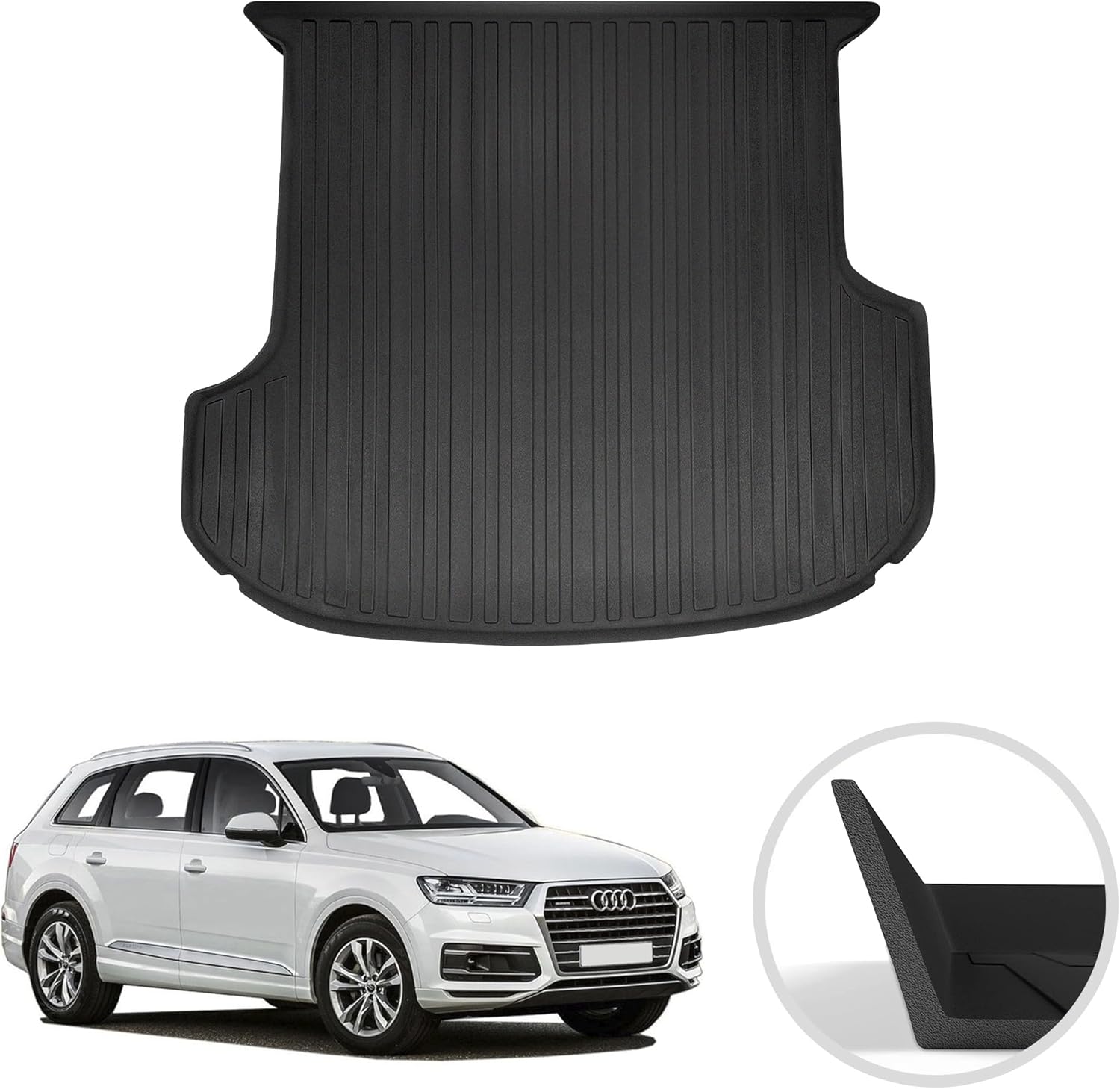 - Perfect Fit For Audi Q7- TrunkNets Inc SUV trunk mat was specially designed for Audi Q7 (2018-2025), no need to measure the trunk size and cut off extra lines, it perfectly fits the size of your trunk. Just place the mat into the trunk or easily take it off when needed, no additional tools are required!
