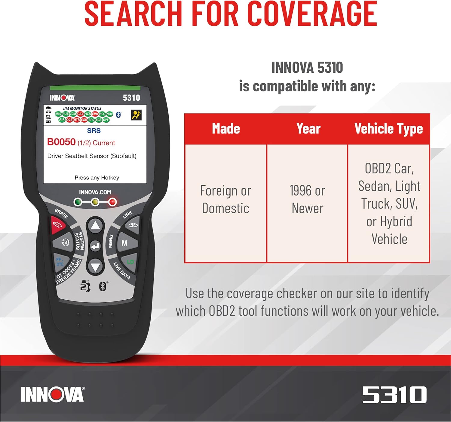 - BUY WITH CONFIDENCE WITH USA DESIGNED AND SUPPORTED PRODUCTS - Designed in the USA, the Innova 5310 is a reliable car code reader and reset tool compatible with 1996-2023 OBD2 vehicles (2024 coming soon), including cars, trucks, SUVs, and hybrids. Use this code reader for cars and trucks as your go-to scan tool and car diagnostic scanner for dependable performance. Backed by expert customer support, it’s the ultimate choice for accurate diagnostics.