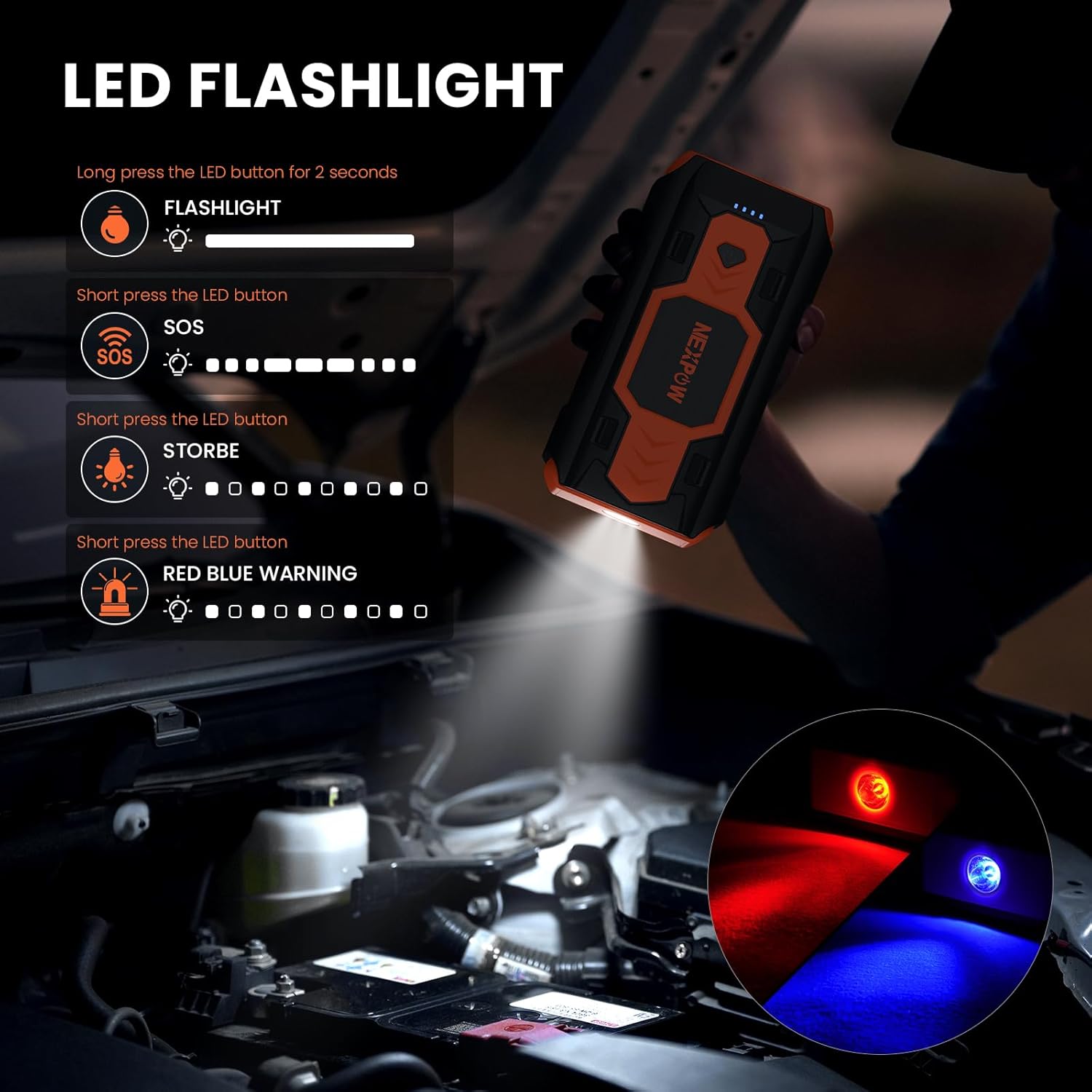 • 4 LED Modes: Not just a car battery jump starter, the NEXPOW jump starter comes equipped with a very bright LED functioning as an emergency flashlight. The blue-red alternate light can function as a traffic hazard warning signal in the event of an accident. 4 modes (Spotlight/Strobe/SOS) & Red Blue Warning