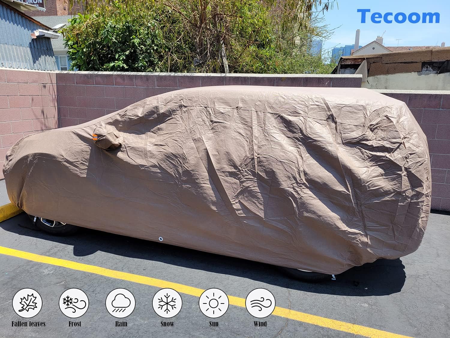 - WATER & WEATHERPROOF: Whether its rain, snow, or a dust storm, you never have to worry about your car getting dirty with Tecoom 3 layer car covers. Thanks to the waterproof materials which coupled with the breathability of the fabrics, Tecoom car covers prevent water from seeping through to make sure your car stays dry even after it rains.