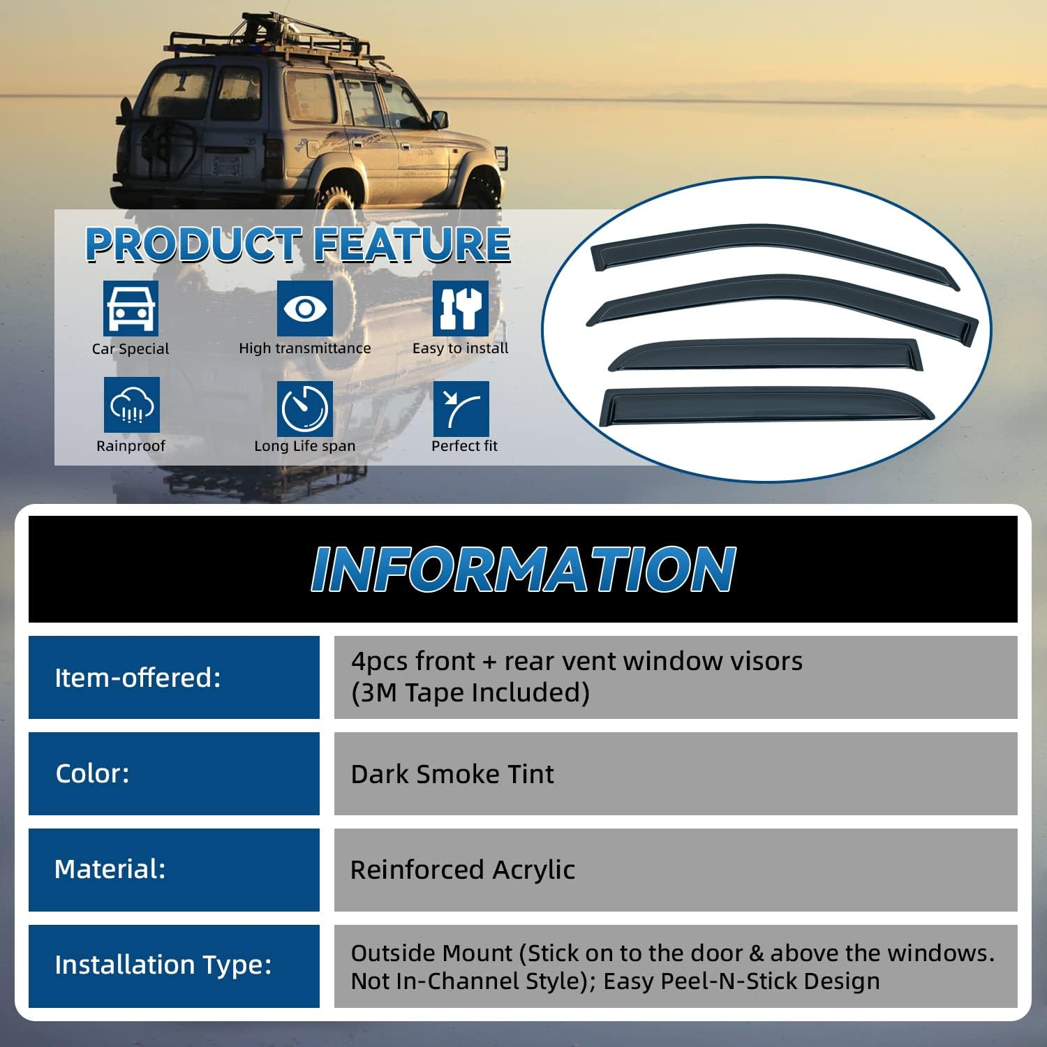 - Package Included: 4pcs front + rear vent window visors (3M Tape Included)