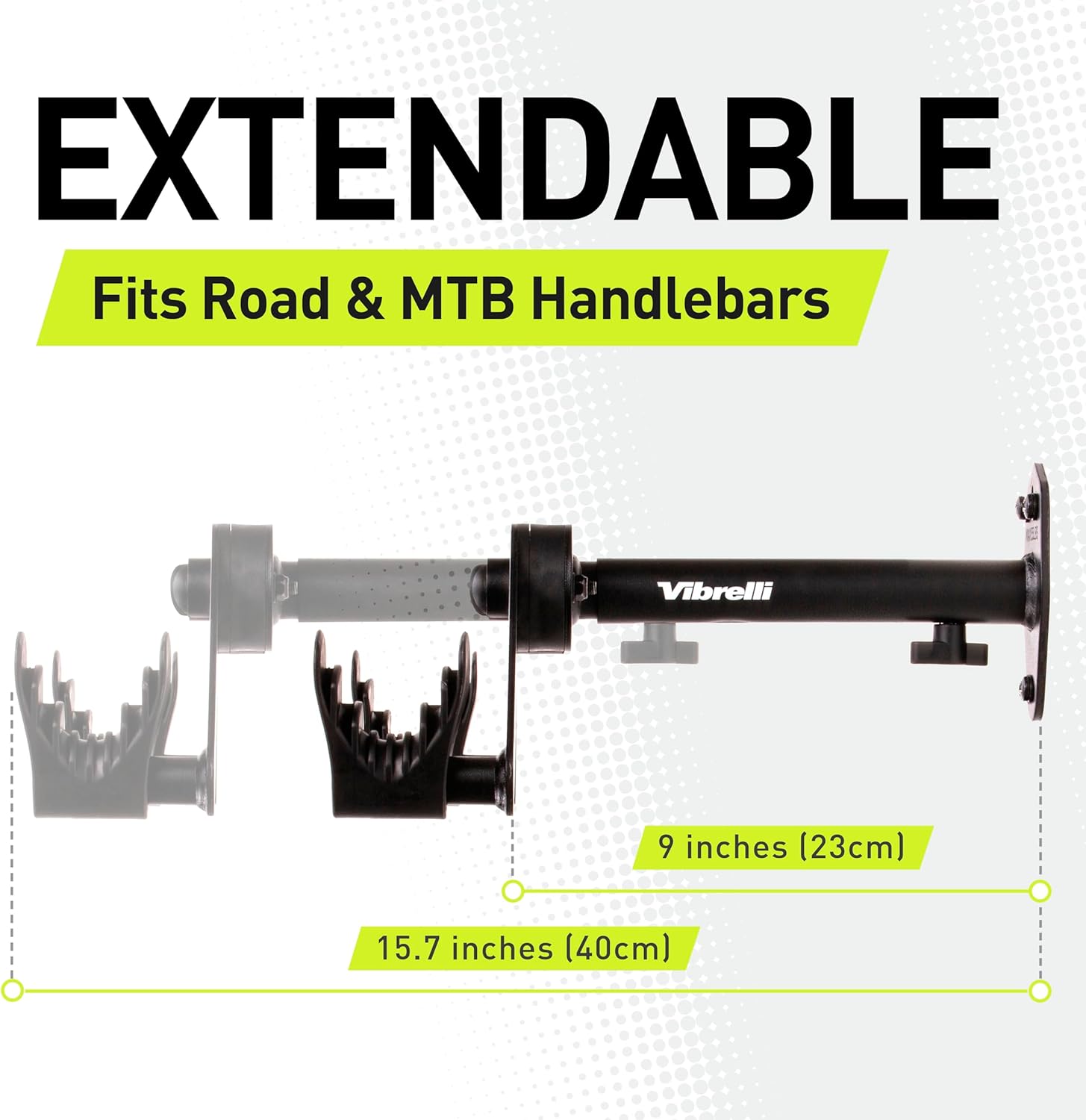 - FULLY ADJUSTABLE - The bike wall mount slides out from the wall to fit narrow and wide handlebars up to 31.5 inch - 800mm wide. Patented push button adjusts the rack arms to fit your bike frame. Flexible frame cradles hold the bike frame, won't crush cables or scratch paint. Includes wheel stabilizing strap to prevent the front wheel swinging