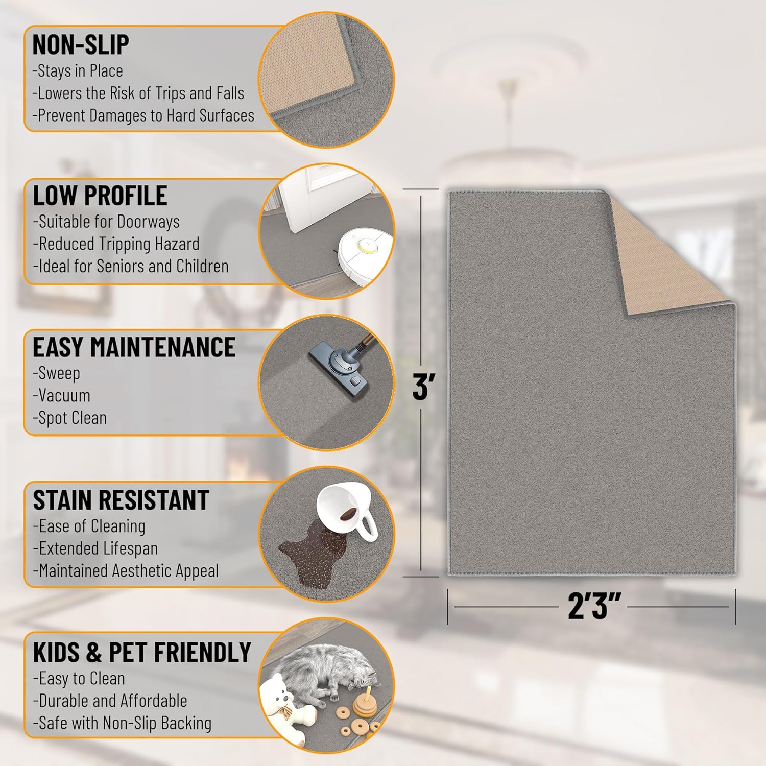 Ottomanson Rugs for Entryway 2'3" x 3' Non Slip Solid Small Area Rugs Durable Front Door Mat Rug Stain Resistant Entrance Rugs for Bathroom Kitchen Bedroom & Living Room, Gray