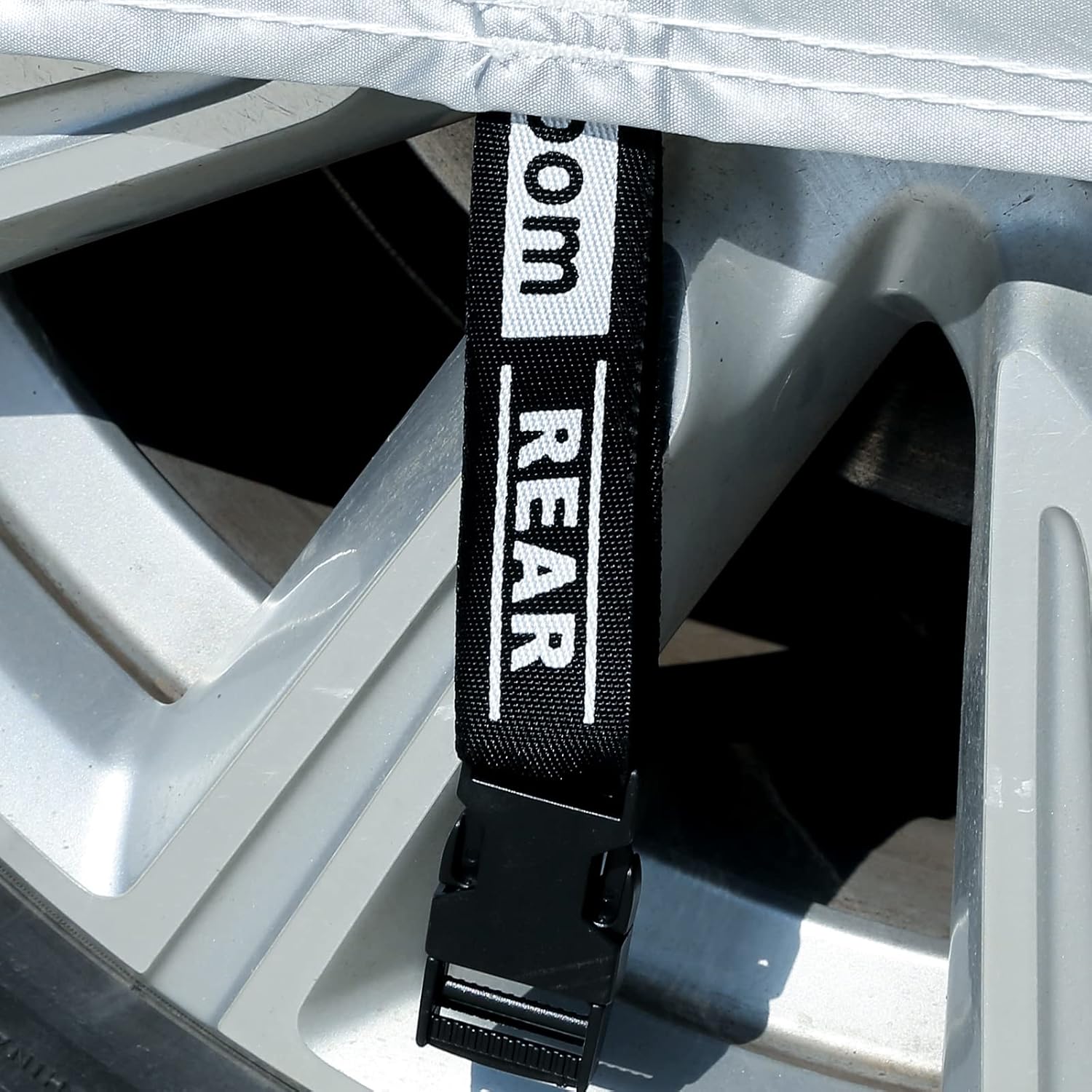 - ăProfessional Designă1. driver door classic zipper design for easy access and convenient. 2. windproof straps & elastic hem at front and rear to protect your car cover from blown away by heavy wind. 3. equipped with combination lock, security anti-theft. 4. reflective stripes remind others at night. 5. mirror pockets.