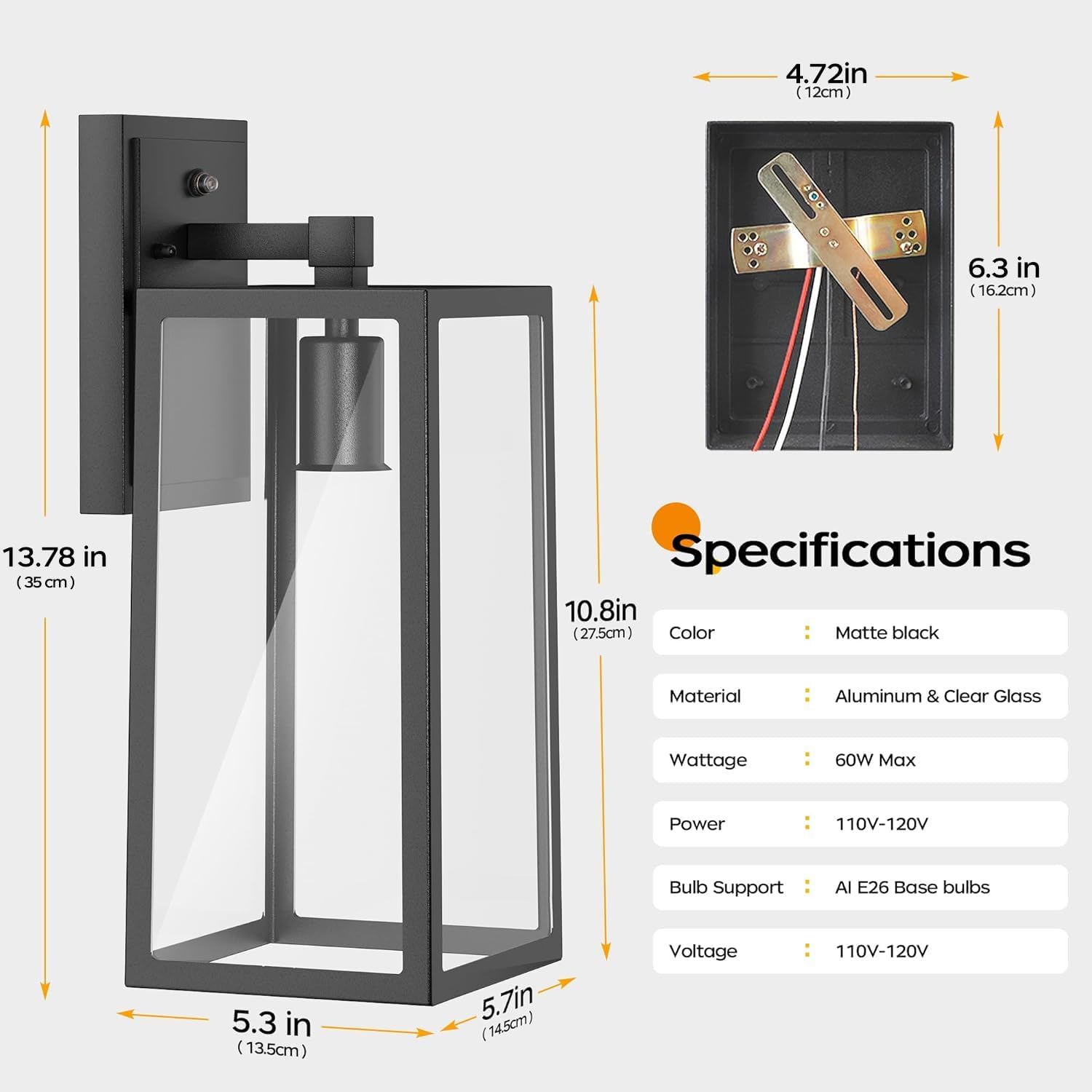 - 🎃【Anti-Rust & Weather Resistance】Made of the heavy-duty die-cast aluminum alloy, our exterior light fixtures is high waterproof rated, seamless connection, anti-rust, and anti-corrosion. No matter rain or snow, ultra-high or low temperatures, this dusk to dawn outdoor lighting can still keep stylish looking after years of using, no worries about the aging problem.