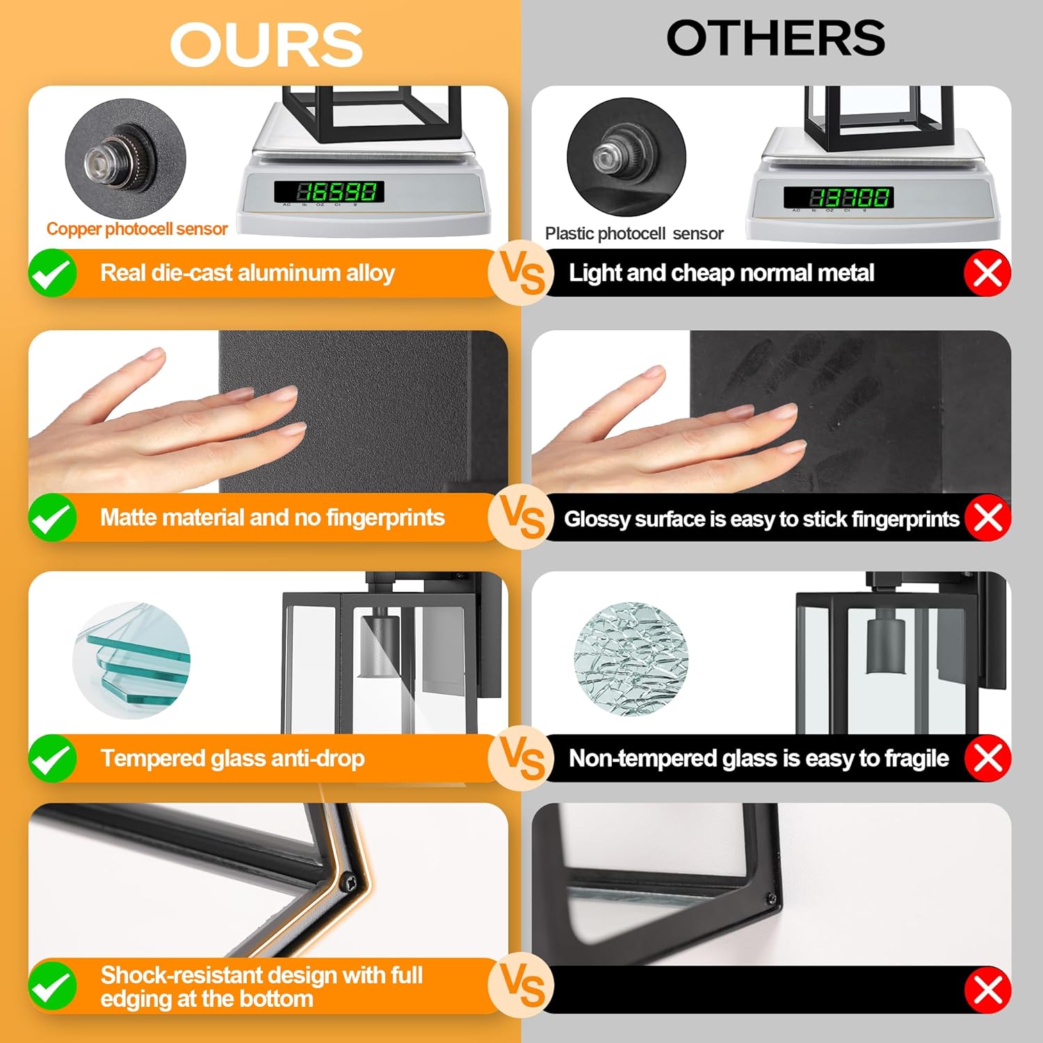 - 🎃【Top-notch Photocell Sensor Technology】Take the upgraded photocell sensor, our outdoor wall light fixtures can sensitively detect the brightness of the surroundings to adjust the switch. Auto turn on at night time when ambient brightness less than 20 LUX, auto turn off at daytime when brightness over 100 LUX. You don't need to turn it on/off manually, free your hands, and save your bills on electricity.
