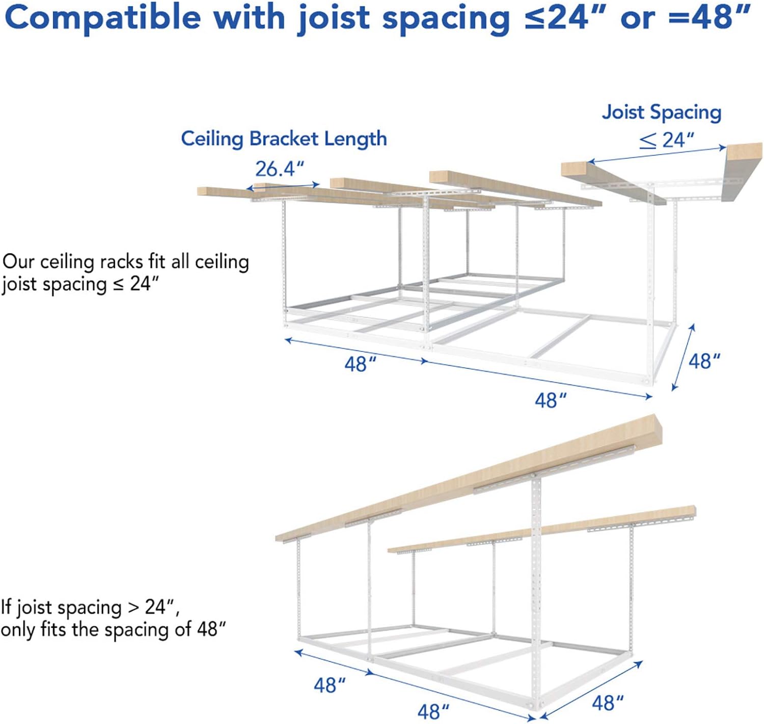 - DIY INSTALLATION: Installation Template helps drill mount holes. This overhead storage rack fits all ceiling joist spacing β€ 24", if joist spacing > 24",only fits the ceiling spacing of 48".