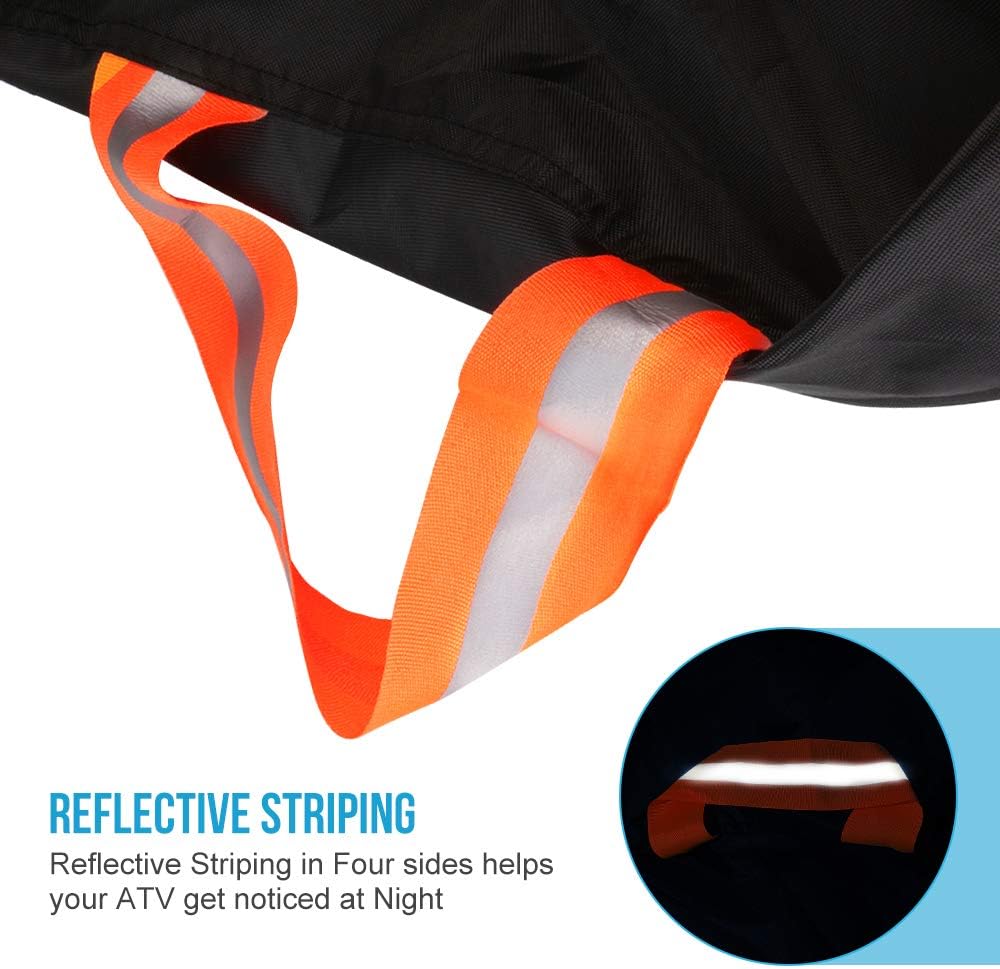 - WINDPROOF STAPS& REFLECTIVE STRAPS-Our lower parts of our ATV Quad tarpaulin are secured with an elastic band and with adjustable straps including buckles to prevent the cover from becoming loose due to wind and weather. 4 phosphorescent strips that serve as warning signs at night, better protecting your ATV cover at night.