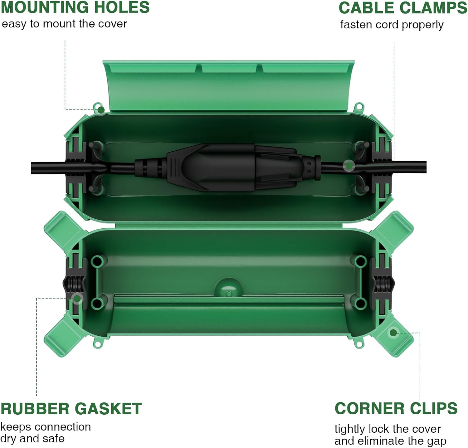 - Made with heavy-duty reinforced PP material to withstand rain, snow, water, dust, dirt and more, continuously protecting outdoor connections from electrical hazard.