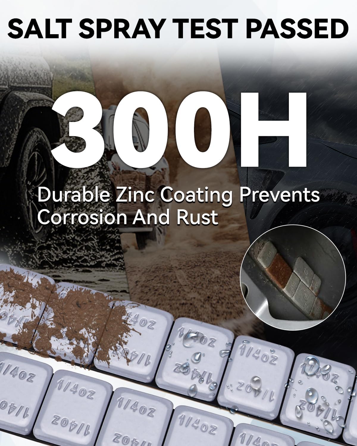 - Anti-Corrosion: The surface of the wheel weight is treated with an electro galvanizing process. 300 hours salt spray test passed, they can be used in humid environments with temperatures ranging from -20°C to 80°C. Even after prolonged use, they won't rust or be damaged