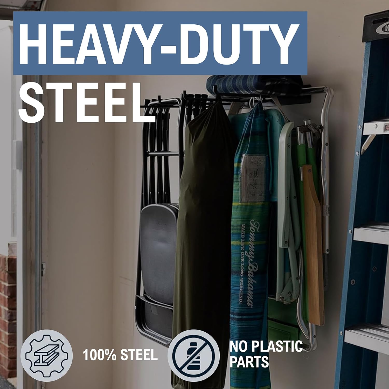 - Heavy Duty Steel Construction – Built from solid, powder-coated steel, this folding chair rack supports up to 200 lbs. Whether you need chair holders for storage or folding chair hangers for garage use, this durable solution is made to last for years.