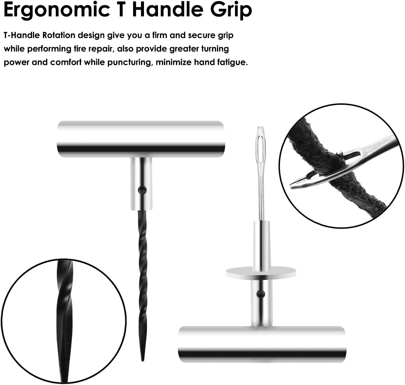 - Our T-handle is made of the solidest steel material which is stronger and not easy to break. And this kit also equips a pencil gauge can measure and maintain the air pressure level of the tire after tire repairing work to ensure the safety of driving