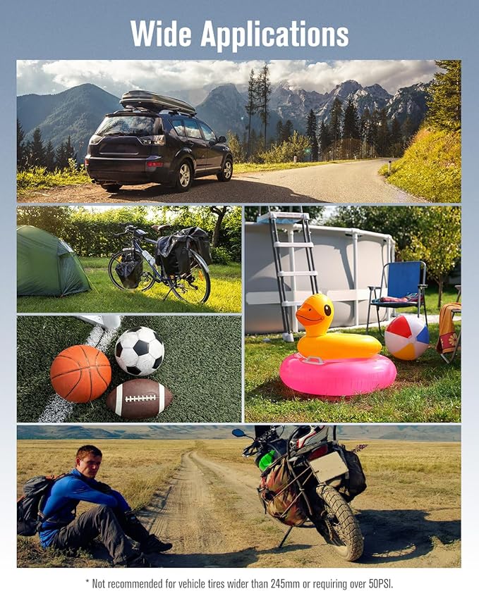 - [Multipurpose] This handheld air compressor is compatible with cars, motorcycles, bicycles, sport balls and small inflatable pool toys. Note: It's not suitable for high-volume inflatables, paddleboards, rafts. And not recommended for vehicle tires wider than 245mm or requiring over 50PSI
