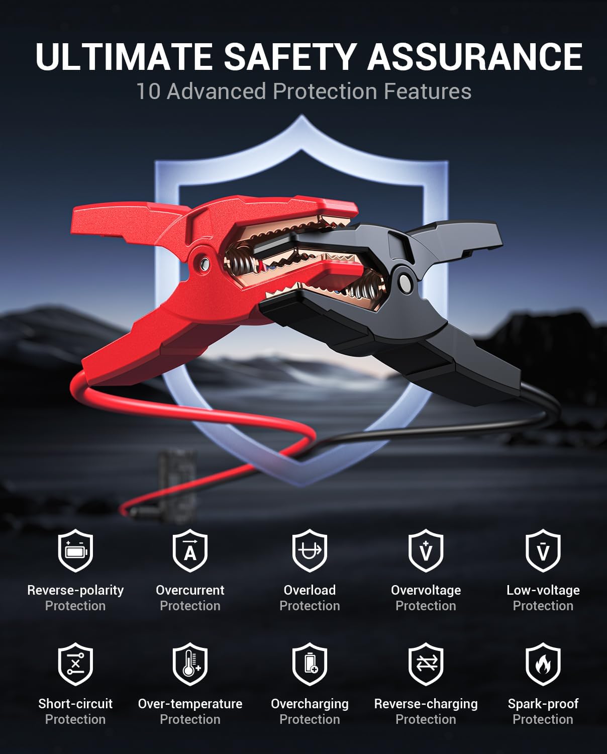 - Smart Safety Protection - The battery jump starter works with intelligent jumper clamps which provide 8 safety protections to ensure it's safe to use.β Also, the jumper clamps indicator light will notify you of any common incorrect operating.