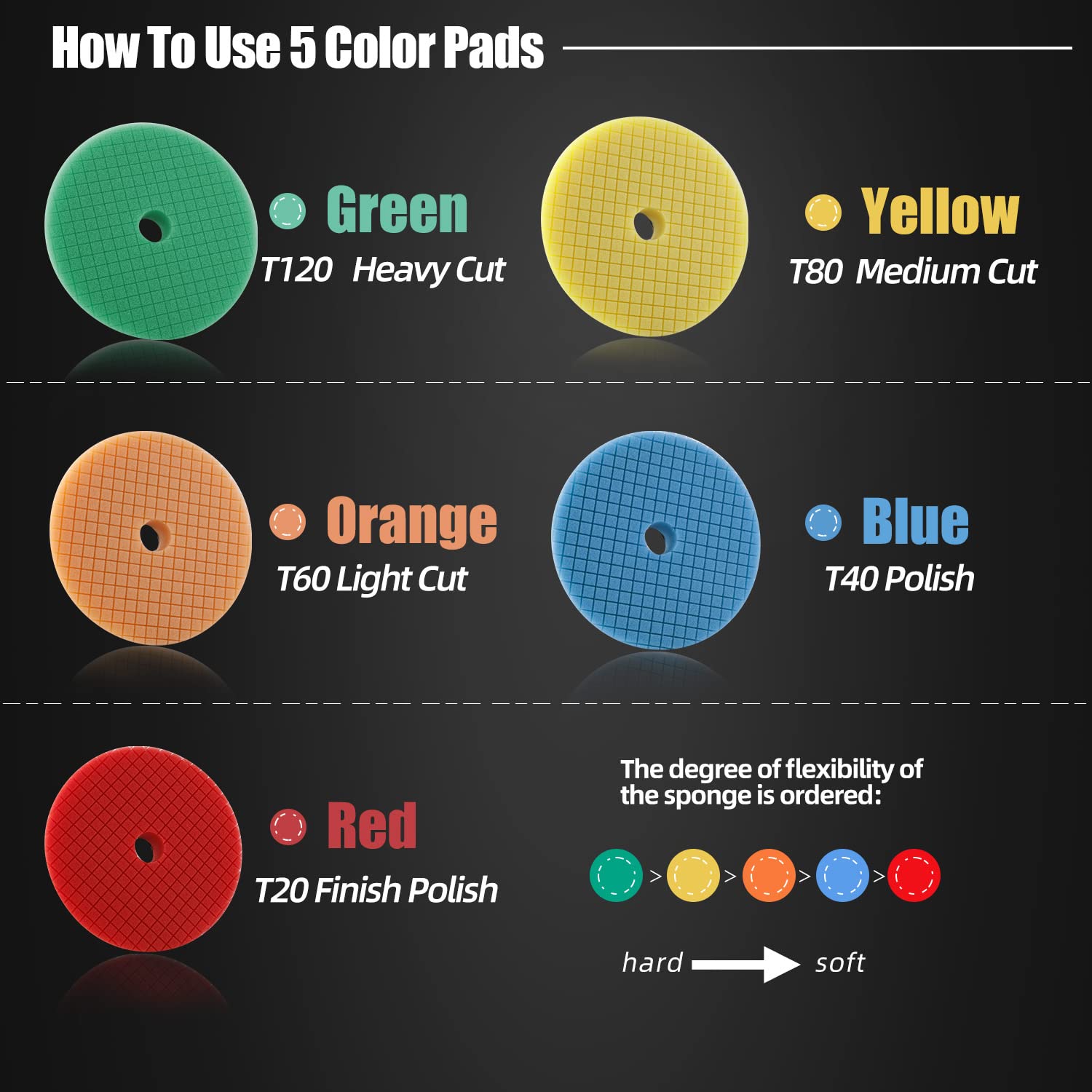 - 3 inches Polishing Pads, package included 5pcs sponge pads, 1pc wool buffer, 1pc white microfiber pad, 1pc gray microfiber pad and 1pc threaded drill adapter which meet lots of polishing needs.