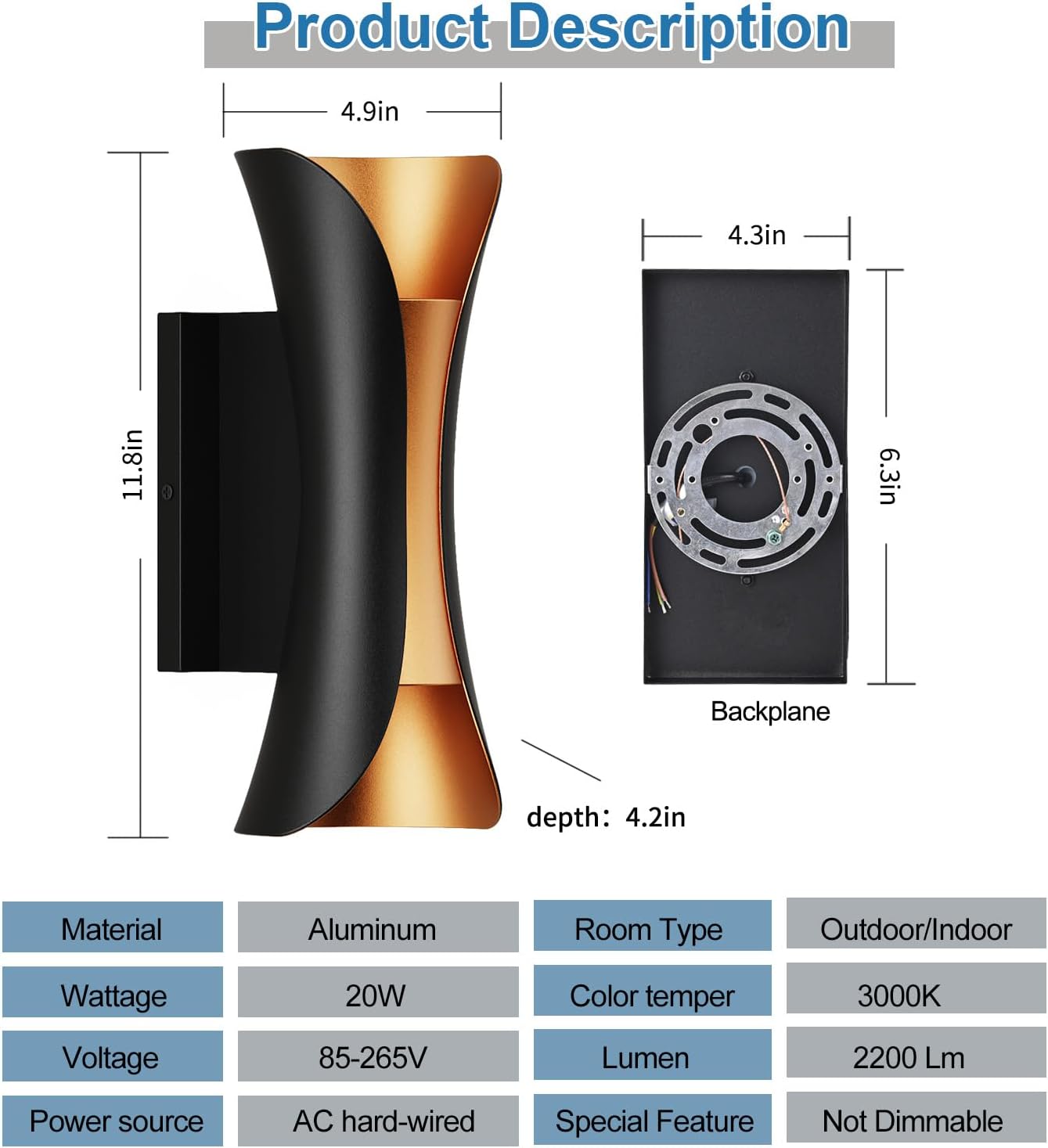 Outdoor Wall Light LED 20W (H) 11.8in Aluminum - Black Gold Waterproof Exterior Lighting Fixture,3000K Warm,Up Down Porch Sconces Brightens to Patio,Garage,Front Door