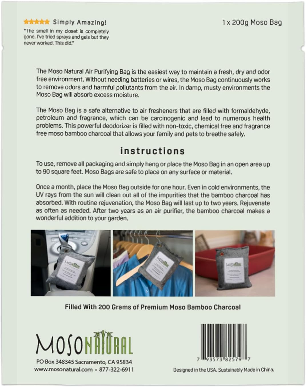 - Closet Deodorizer & Pet Odor Eliminator: The Moso Natural activated charcoal odor absorber works like a magnetic sponge to actively absorb bad smells from the air without giving off a scent.