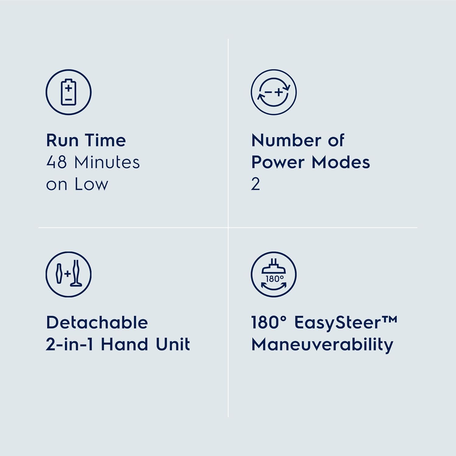 - Cordless Cleaning with Extended Power: Enjoy up to 48 minutes* of run time with the Turbo Power HD lithium battery, while the LED charge indicator conveniently lets you know when itโs time to recharge your Electrolux vacuum
