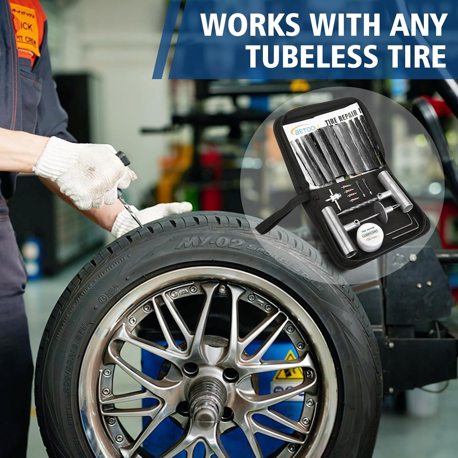 BETOOLL Tire Repair Kit, 44 Pcs Professional Heavy Duty Universal Emergency Flat Tire Repair Kit to Fix Punctures, for car Motorcycle, Truck, Golf Cart, ATV, Tractor, ARB, RV, SUV, Trailer etc.