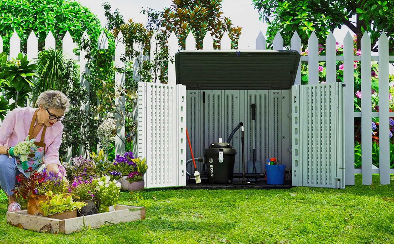 - đăDOUBLE WALL SYSTEMăAll material we made ADDOK Horizontal Storage Shed is environmental friendly. Compared with tradition PVC material we made with double layer HDPE resin panels uv-resistant which has no odor, won't rust, decay and needn't virtually maintenance and durable that will last for years.