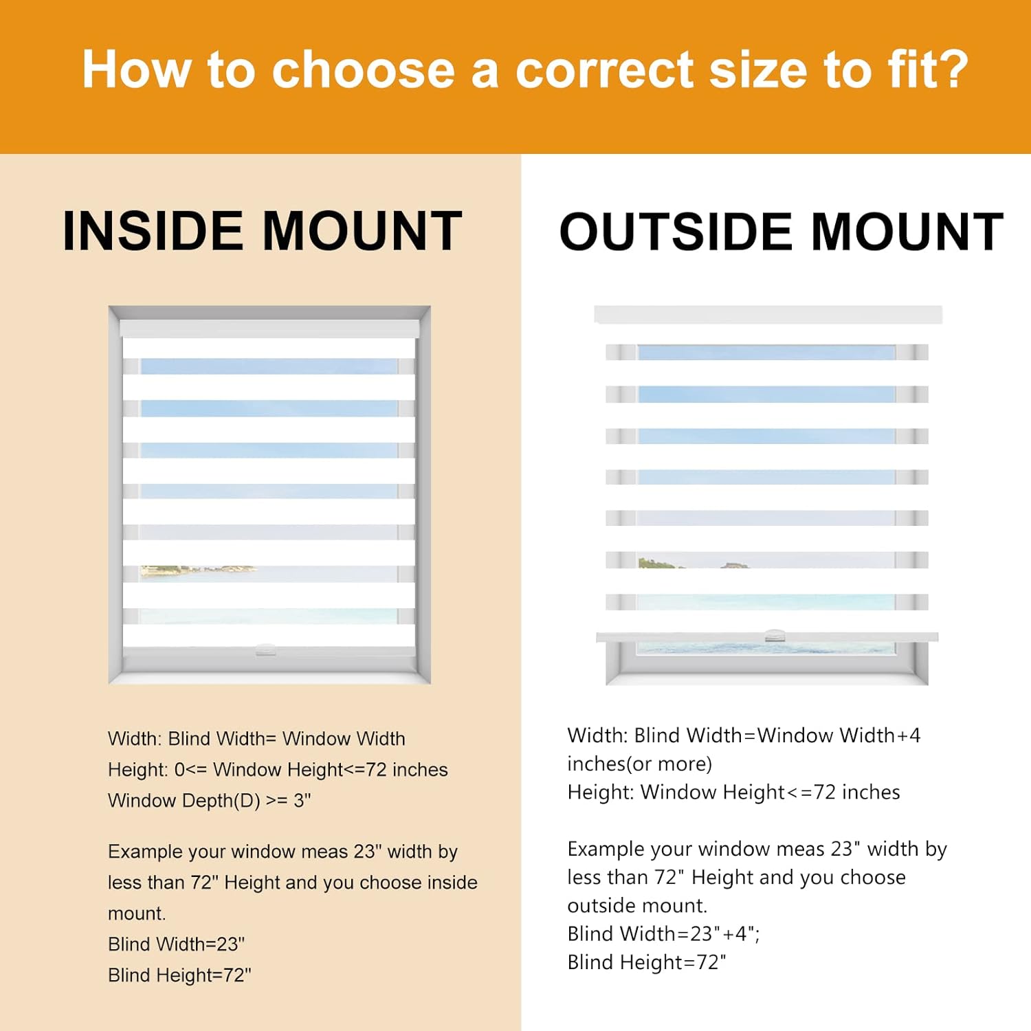 - 【How to choose a correct size to fit? Example your window meas 23" width x less than 72" Height.】INSIDE MOUNT: Window Width is Blind width. Blind Width=23"; Blind Height=72". OUTSIDE MOUNT: Plus at least 4" is blind width, Blind Width=23"+4"=27"; Blind Height=72".【Pls Note】Fabric width will be 0.8" narrower than the size of the blind.