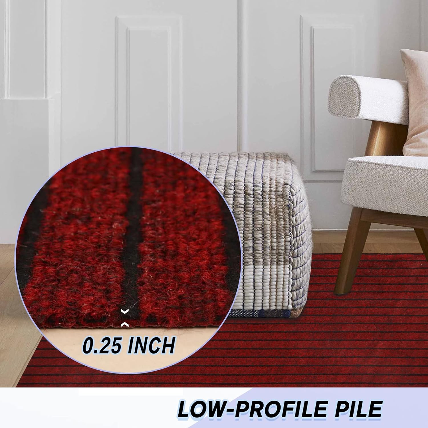 - Low Profile Design: The carpet heigh is 0.25 inch-Stripe Rug, 0.25 inch-Grid Rug and 0.35 inch-Monocolor Rug. Does not add bulk to your floor and allow for perfect placement under furniture and doors as well as on stairs, any high traffic area, indoors or outdoors.