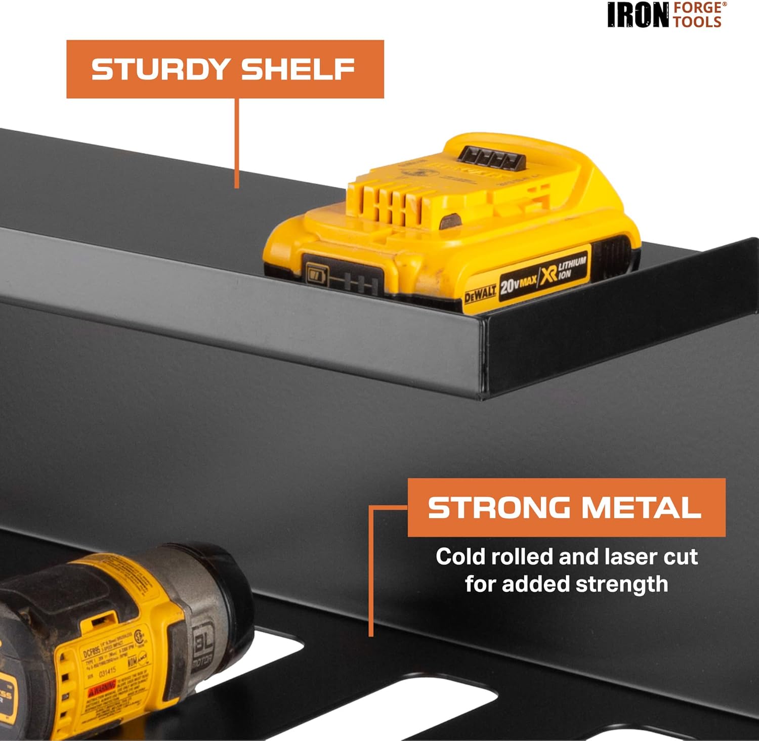 - Extra Storage Rack: Iron Forge storage rack can hold at least 5 drilling tools and different accessories, which have a distinctive design. A wall-mounted design makes excellent use of unused wall space and lets you see where your tools are. You may keep all of your often-used project tools nicely arranged and handy with the aid of this floating shelf.
