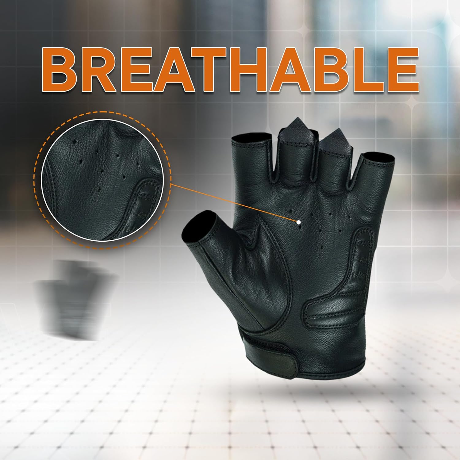 - Premium Leather: Daniel Smart Fingerless Motorcycle Gloves are made of excellent Goatskin leather that provides natural protection and will not tear or crack when exposed to conditions like sunlight, heat, or moisture.