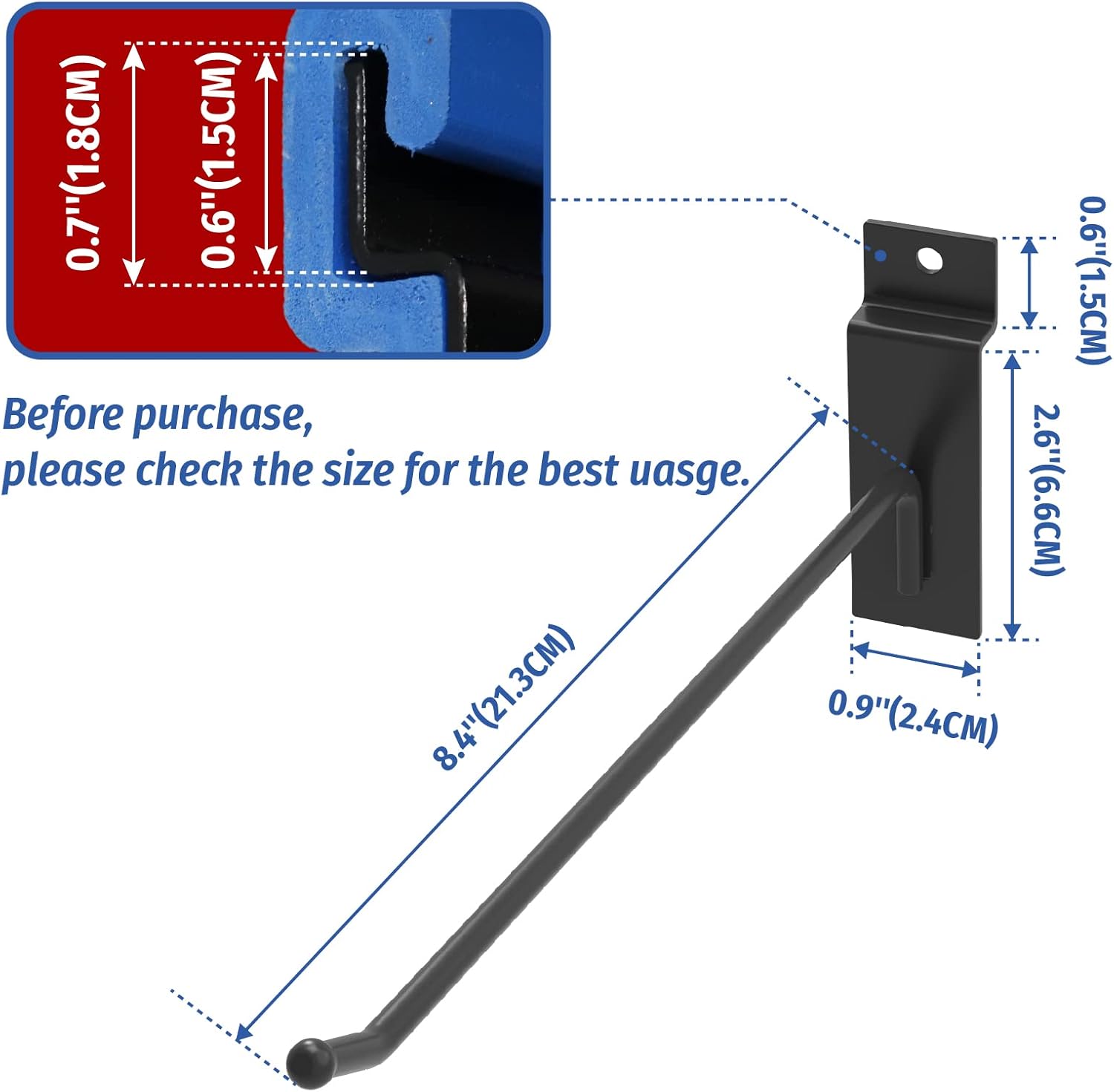 - 【PREMIUM QUALITY HOOK】 Our slatwall hooks are made of premium quality stainless steel that allows years of use without bent or deforms. It has hardened steel construction to provide maximum strength and a corrosion-resistant black oxidation finish for durability.