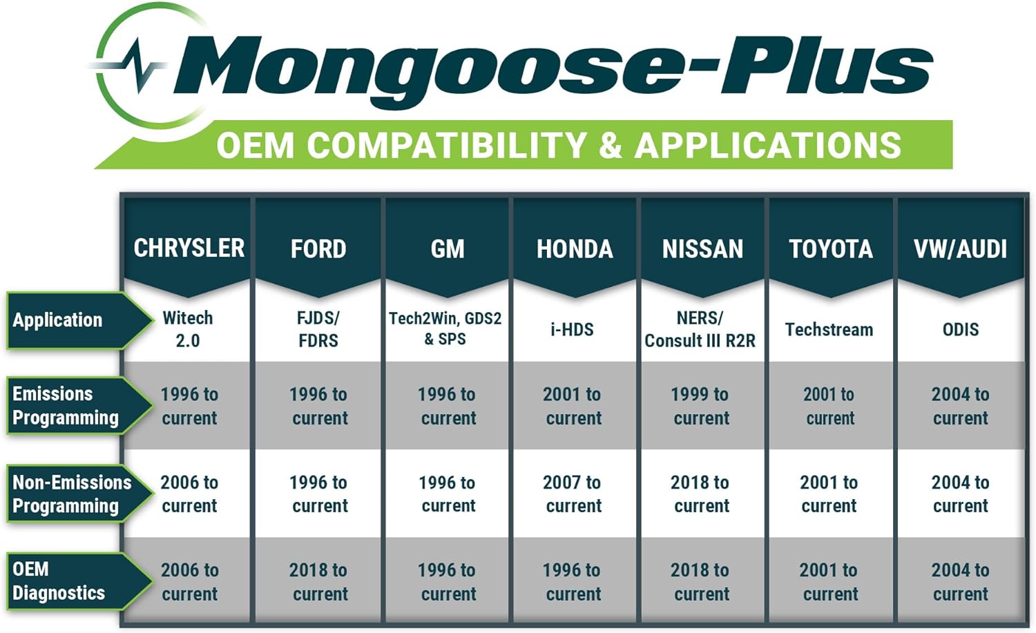 - Industry-leading J2534 Pass-Thru Technology: Enabling diagnostics, reprogramming and security functions for dealerships and the independent repair facility. Economical and compact pass-thru devices provides an easy-to-use interface that allows you to repair complex vehicles with OE applications in your shop. Each type (see single branded types above) Mongoose-Plus is engineered to work with one of the following OEM's J2534 applications for Chrysler, Ford, GM, Nissan, Toyota, & VW/Audi.