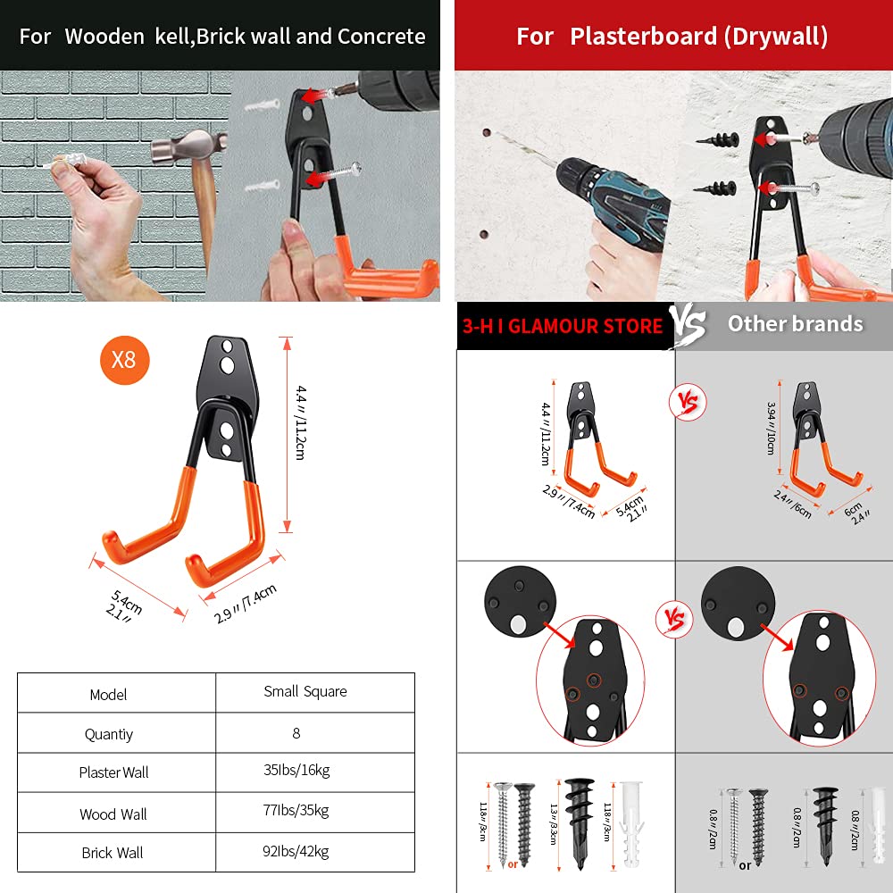 - PERFECT FOR HEAVY OBJECTS โGarage hooks is a set of 8 wall mounted double hooks,8 small U hook . The extended length and anti-slip coating let you organise and hang heavy objects for up to 80lbs.