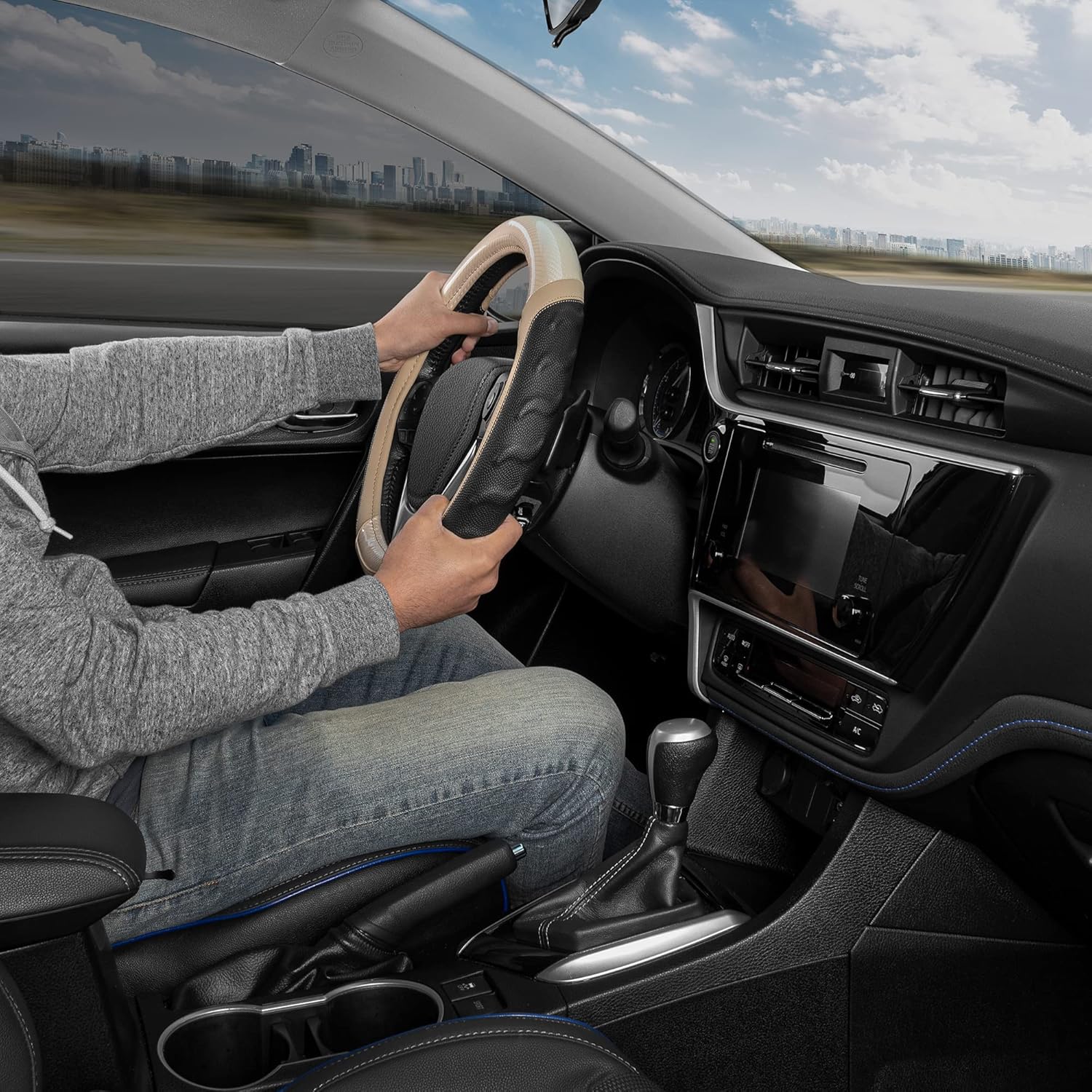 Motor Trend UltraSport Beige Carbon Fiber Steering Wheel Cover, Standard 15 inch Size, Black Faux Leather Comfort Grip, Car Steering Wheel Cover for Auto Truck Van SUV
