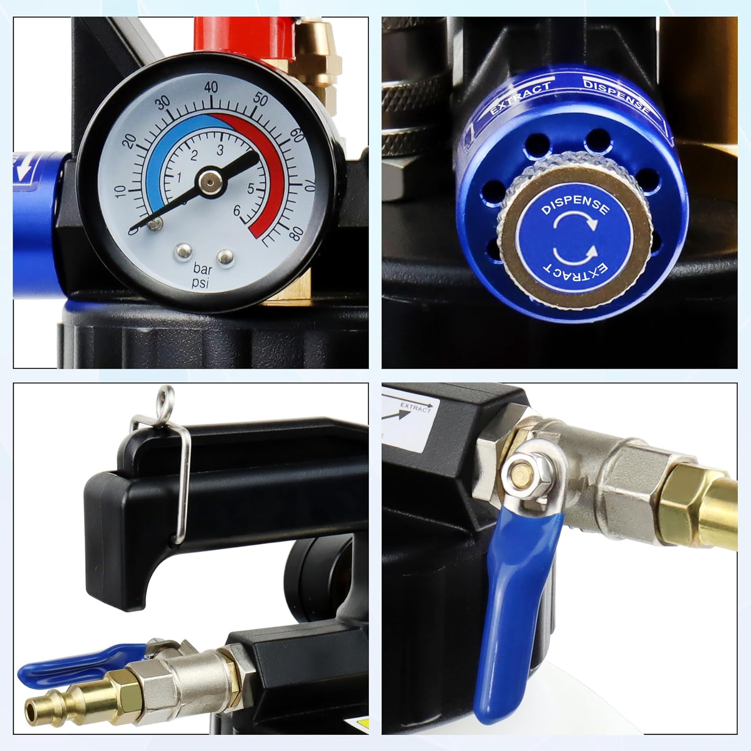 - Handsfree Pneumatic Helper: This transmission fluid pump will keep you away from boring laborious manual work with air compressors. Two-way extractor and dispenser tool saves energy and time; Don't even need to pour oil manually! You only need to switch the extract or dispense mode and buckle the self-locking device. Large capacity avoids the trouble of repeated refueling and satisfys refueling needs of multiple vehicles at once. Quick and sparkless